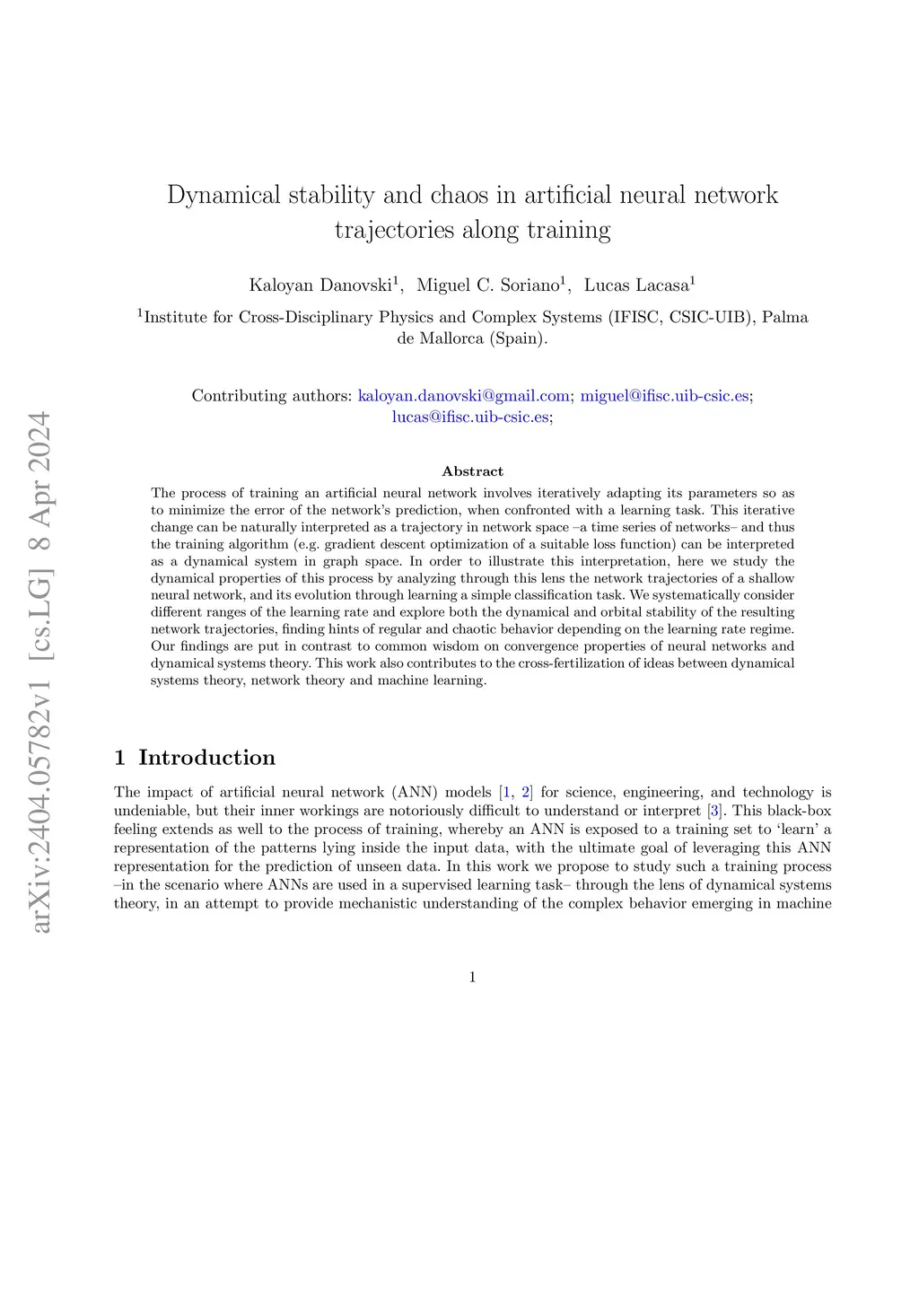The process of training an artificial neural network involves iteratively adapting its parameters so as to minimize the error of the network's prediction, when confronted with a learning task. This iterative change can be naturally interpreted as a trajectory in network space -- a time series of networks -- and thus the training algorithm (e.g. gradient descent optimization of a suitable loss function) can be interpreted as a dynamical system in graph space. In order to illustrate this interpretation, here we study the dynamical properties of this process by analyzing through this lens the network trajectories of a shallow neural network, and its evolution through learning a simple classification task. We systematically consider different ranges of the learning rate and explore both the dynamical and orbital stability of the resulting network trajectories, finding hints of regular and chaotic behavior depending on the learning rate regime. Our findings are put in contrast to common wisdom on convergence properties of neural networks and dynamical systems theory. This work also contributes to the cross-fertilization of ideas between dynamical systems theory, network theory and machine learning