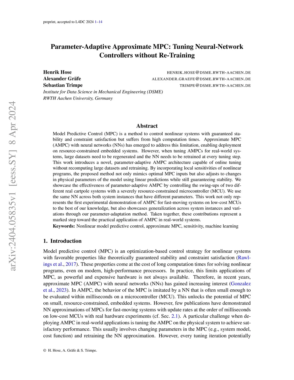 Model Predictive Control (MPC) is a method to control nonlinear systems with guaranteed stability and constraint satisfaction but suffers from high computation times. Approximate MPC (AMPC) with neural networks (NNs) has emerged to address this limitation, enabling deployment on resource-constrained embedded systems. However, when tuning AMPCs for real-world systems, large datasets need to be regenerated and the NN needs to be retrained at every tuning step. This work introduces a novel, parameter-adaptive AMPC architecture capable of online tuning without recomputing large datasets and retraining. By incorporating local sensitivities of nonlinear programs, the proposed method not only mimics optimal MPC inputs but also adjusts to known changes in physical parameters of the model using linear predictions while still guaranteeing stability. We showcase the effectiveness of parameter-adaptive AMPC by controlling the swing-ups of two different real cartpole systems with a severely resource-constrained microcontroller (MCU). We use the same NN across both system instances that have different parameters. This work not only represents the first experimental demonstration of AMPC for fast-moving systems on low-cost MCUs to the best of our knowledge, but also showcases generalization across system instances and variations through our parameter-adaptation method. Taken together, these contributions represent a marked step toward the practical application of AMPC in real-world systems.