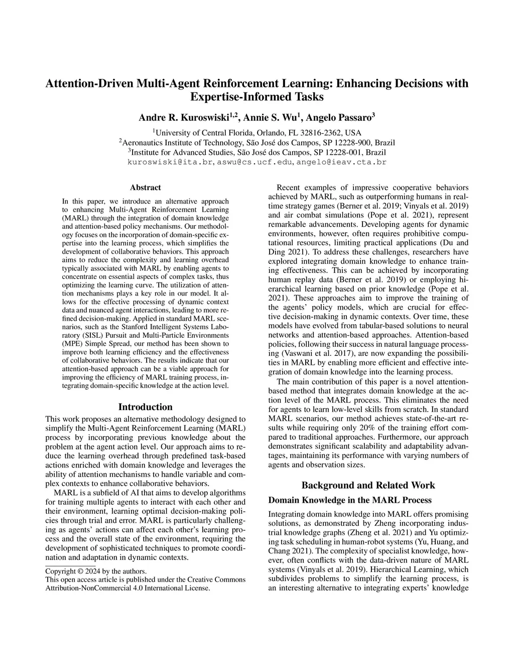 In this paper, we introduce an alternative approach to enhancing Multi-Agent Reinforcement Learning (MARL) through the integration of domain knowledge and attention-based policy mechanisms. Our methodology focuses on the incorporation of domain-specific expertise into the learning process, which simplifies the development of collaborative behaviors. This approach aims to reduce the complexity and learning overhead typically associated with MARL by enabling agents to concentrate on essential aspects of complex tasks, thus optimizing the learning curve. The utilization of attention mechanisms plays a key role in our model. It allows for the effective processing of dynamic context data and nuanced agent interactions, leading to more refined decision-making. Applied in standard MARL scenarios, such as the Stanford Intelligent Systems Laboratory (SISL) Pursuit and Multi-Particle Environments (MPE) Simple Spread, our method has been shown to improve both learning efficiency and the effectiveness of collaborative behaviors. The results indicate that our attention-based approach can be a viable approach for improving the efficiency of MARL training process, integrating domain-specific knowledge at the action level.