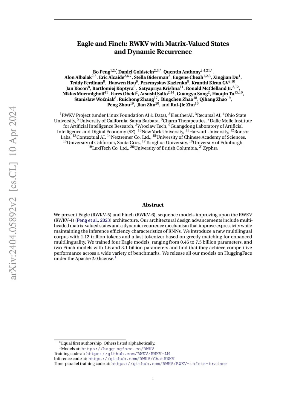 We present Eagle (RWKV-5) and Finch (RWKV-6), sequence models improving upon the RWKV (RWKV-4) architecture. Our architectural design advancements include multi-headed matrix-valued states and a dynamic recurrence mechanism that improve expressivity while maintaining the inference efficiency characteristics of RNNs. We introduce a new multilingual corpus with 1.12 trillion tokens and a fast tokenizer based on greedy matching for enhanced multilinguality. We trained four Eagle models, ranging from 0.46 to 7.5 billion parameters, and two Finch models with 1.6 and 3.1 billion parameters and find that they achieve competitive performance across a wide variety of benchmarks. We release all our models on HuggingFace under the Apache 2.0 license. Models at: https://huggingface.co/RWKV Training code at: https://github.com/RWKV/RWKV-LM Inference code at: https://github.com/RWKV/ChatRWKV Time-parallel training code at: https://github.com/RWKV/RWKV-infctx-trainer