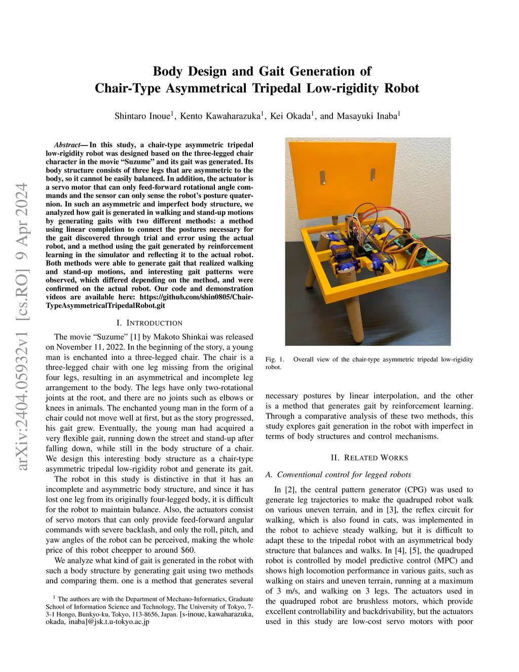 In this study, a chair-type asymmetric tripedal low-rigidity robot was designed based on the three-legged chair character in the movie "Suzume" and its gait was generated. Its body structure consists of three legs that are asymmetric to the body, so it cannot be easily balanced. In addition, the actuator is a servo motor that can only feed-forward rotational angle commands and the sensor can only sense the robot's posture quaternion. In such an asymmetric and imperfect body structure, we analyzed how gait is generated in walking and stand-up motions by generating gaits with two different methods: a method using linear completion to connect the postures necessary for the gait discovered through trial and error using the actual robot, and a method using the gait generated by reinforcement learning in the simulator and reflecting it to the actual robot. Both methods were able to generate gait that realized walking and stand-up motions, and interesting gait patterns were observed, which differed depending on the method, and were confirmed on the actual robot. Our code and demonstration videos are available here: https://github.com/shin0805/Chair-TypeAsymmetricalTripedalRobot.git