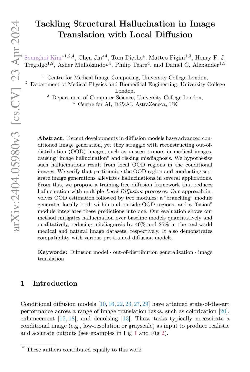 Recent developments in diffusion models have advanced conditioned image generation, yet they struggle with reconstructing out-of-distribution (OOD) images, such as unseen tumors in medical images, causing "image hallucination" and risking misdiagnosis. We hypothesize such hallucinations result from local OOD regions in the conditional images. We verify that partitioning the OOD region and conducting separate image generations alleviates hallucinations in several applications. From this, we propose a training-free diffusion framework that reduces hallucination with multiple Local Diffusion processes. Our approach involves OOD estimation followed by two modules: a "branching" module generates locally both within and outside OOD regions, and a "fusion" module integrates these predictions into one. Our evaluation shows our method mitigates hallucination over baseline models quantitatively and qualitatively, reducing misdiagnosis by 40% and 25% in the real-world medical and natural image datasets, respectively. It also demonstrates compatibility with various pre-trained diffusion models.