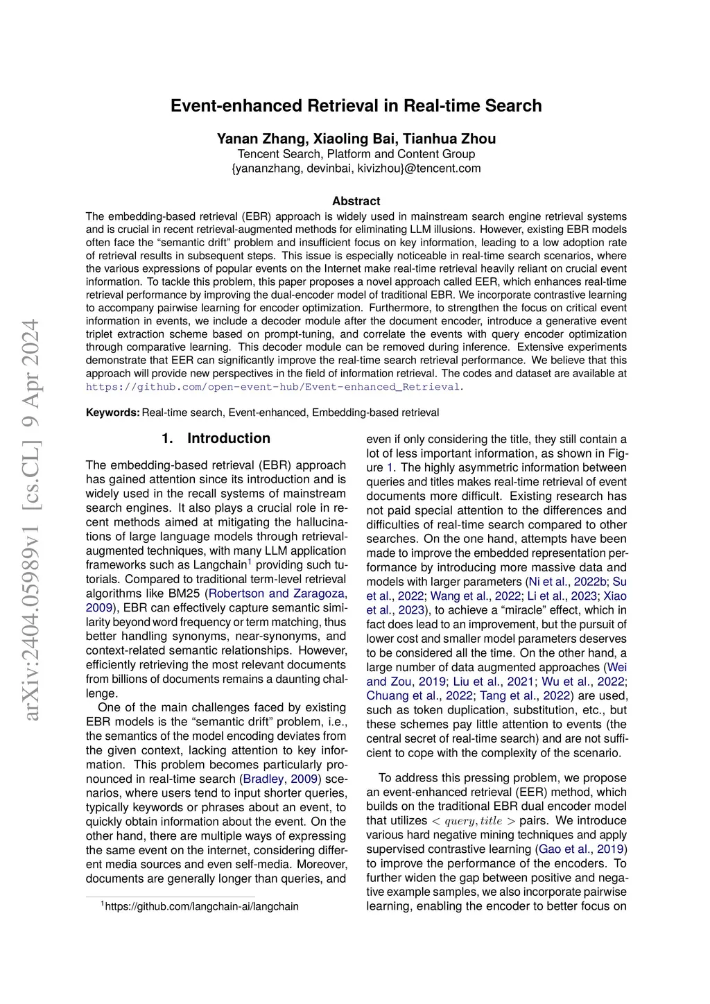 The embedding-based retrieval (EBR) approach is widely used in mainstream search engine retrieval systems and is crucial in recent retrieval-augmented methods for eliminating LLM illusions. However, existing EBR models often face the "semantic drift" problem and insufficient focus on key information, leading to a low adoption rate of retrieval results in subsequent steps. This issue is especially noticeable in real-time search scenarios, where the various expressions of popular events on the Internet make real-time retrieval heavily reliant on crucial event information. To tackle this problem, this paper proposes a novel approach called EER, which enhances real-time retrieval performance by improving the dual-encoder model of traditional EBR. We incorporate contrastive learning to accompany pairwise learning for encoder optimization. Furthermore, to strengthen the focus on critical event information in events, we include a decoder module after the document encoder, introduce a generative event triplet extraction scheme based on prompt-tuning, and correlate the events with query encoder optimization through comparative learning. This decoder module can be removed during inference. Extensive experiments demonstrate that EER can significantly improve the real-time search retrieval performance. We believe that this approach will provide new perspectives in the field of information retrieval. The codes and dataset are available at https://github.com/open-event-hub/Event-enhanced_Retrieval .