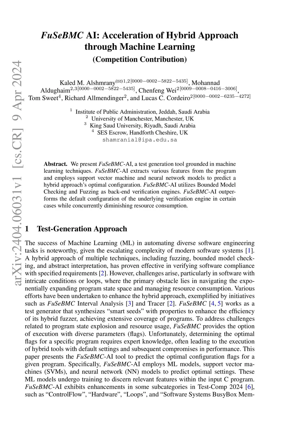 We present FuSeBMC-AI, a test generation tool grounded in machine learning techniques. FuSeBMC-AI extracts various features from the program and employs support vector machine and neural network models to predict a hybrid approach optimal configuration. FuSeBMC-AI utilizes Bounded Model Checking and Fuzzing as back-end verification engines. FuSeBMC-AI outperforms the default configuration of the underlying verification engine in certain cases while concurrently diminishing resource consumption.