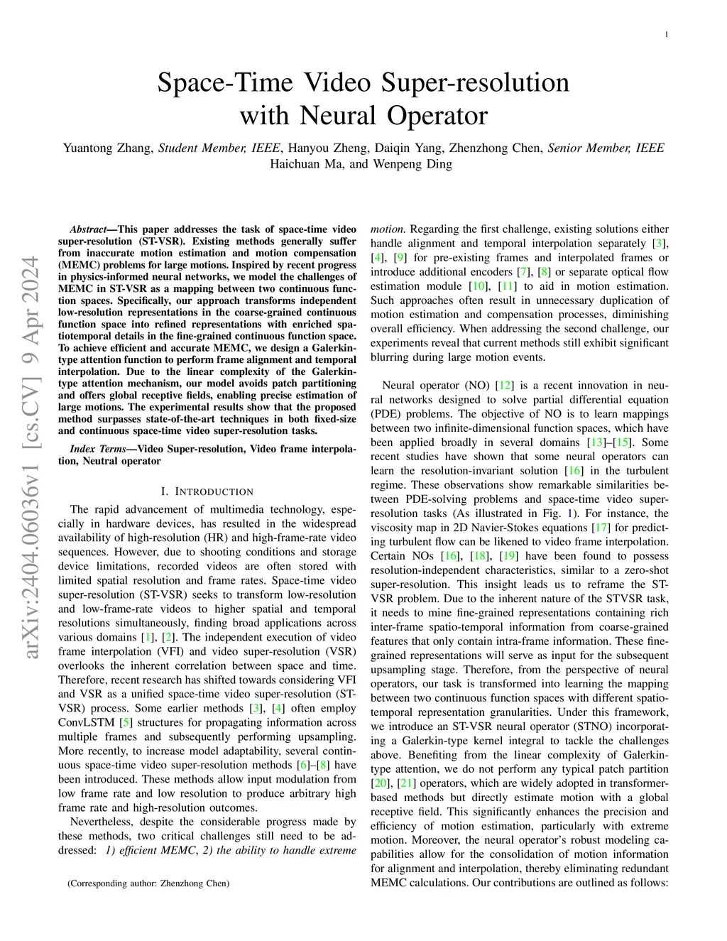 This paper addresses the task of space-time video super-resolution (ST-VSR). Existing methods generally suffer from inaccurate motion estimation and motion compensation (MEMC) problems for large motions. Inspired by recent progress in physics-informed neural networks, we model the challenges of MEMC in ST-VSR as a mapping between two continuous function spaces. Specifically, our approach transforms independent low-resolution representations in the coarse-grained continuous function space into refined representations with enriched spatiotemporal details in the fine-grained continuous function space. To achieve efficient and accurate MEMC, we design a Galerkin-type attention function to perform frame alignment and temporal interpolation. Due to the linear complexity of the Galerkin-type attention mechanism, our model avoids patch partitioning and offers global receptive fields, enabling precise estimation of large motions. The experimental results show that the proposed method surpasses state-of-the-art techniques in both fixed-size and continuous space-time video super-resolution tasks.