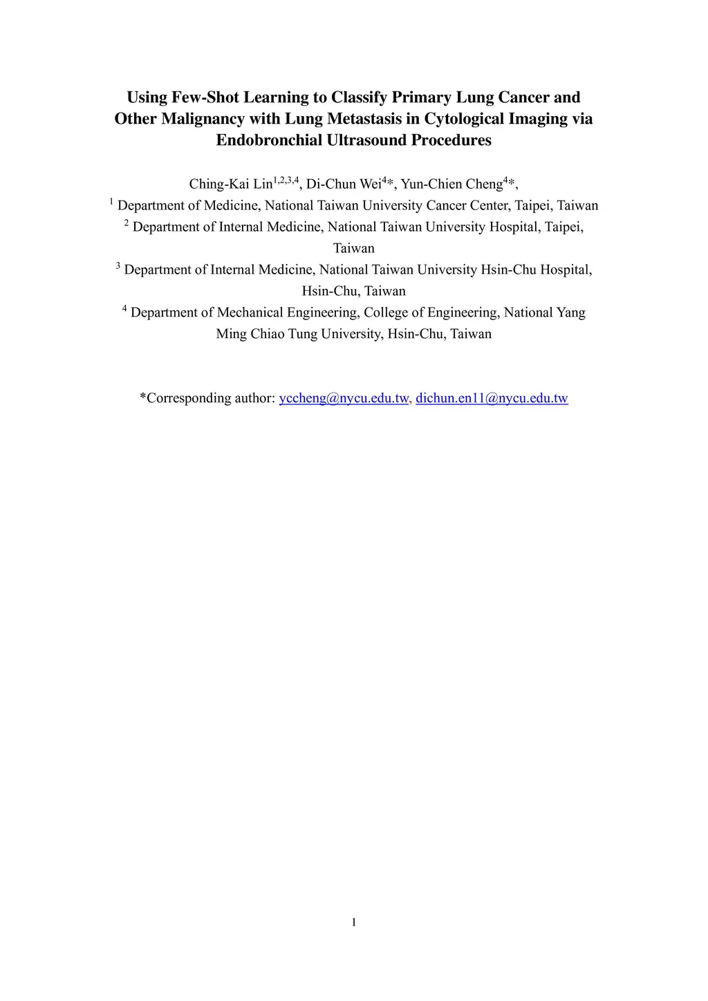 Using Few-Shot Learning to Classify Primary Lung Cancer and Other Malignancy with Lung Metastasis in Cytological Imaging via Endobronchial Ultrasound Procedures