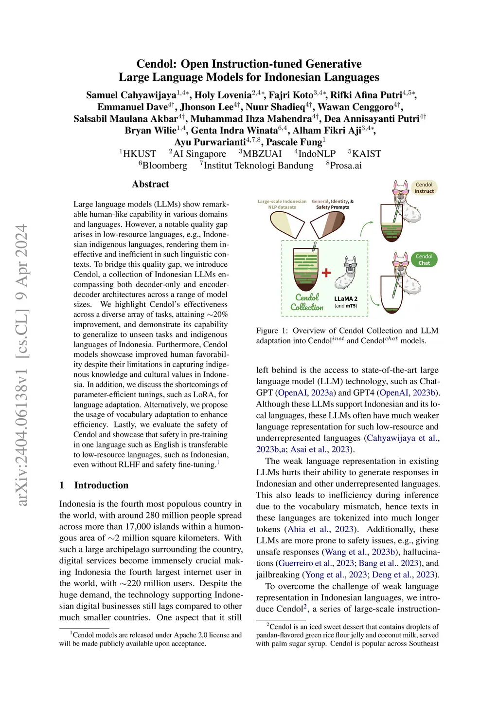 Large language models (LLMs) show remarkable human-like capability in various domains and languages. However, a notable quality gap arises in low-resource languages, e.g., Indonesian indigenous languages, rendering them ineffective and inefficient in such linguistic contexts. To bridge this quality gap, we introduce Cendol, a collection of Indonesian LLMs encompassing both decoder-only and encoder-decoder architectures across a range of model sizes. We highlight Cendol's effectiveness across a diverse array of tasks, attaining 20% improvement, and demonstrate its capability to generalize to unseen tasks and indigenous languages of Indonesia. Furthermore, Cendol models showcase improved human favorability despite their limitations in capturing indigenous knowledge and cultural values in Indonesia. In addition, we discuss the shortcomings of parameter-efficient tunings, such as LoRA, for language adaptation. Alternatively, we propose the usage of vocabulary adaptation to enhance efficiency. Lastly, we evaluate the safety of Cendol and showcase that safety in pre-training in one language such as English is transferable to low-resource languages, such as Indonesian, even without RLHF and safety fine-tuning.
