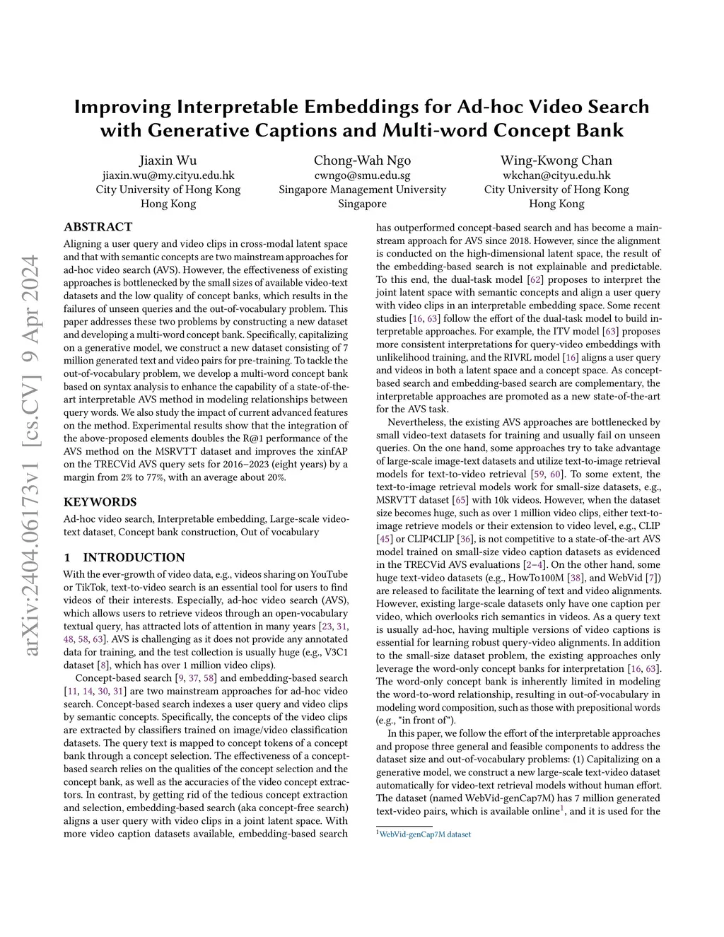 Aligning a user query and video clips in cross-modal latent space and that with semantic concepts are two mainstream approaches for ad-hoc video search (AVS). However, the effectiveness of existing approaches is bottlenecked by the small sizes of available video-text datasets and the low quality of concept banks, which results in the failures of unseen queries and the out-of-vocabulary problem. This paper addresses these two problems by constructing a new dataset and developing a multi-word concept bank. Specifically, capitalizing on a generative model, we construct a new dataset consisting of 7 million generated text and video pairs for pre-training. To tackle the out-of-vocabulary problem, we develop a multi-word concept bank based on syntax analysis to enhance the capability of a state-of-the-art interpretable AVS method in modeling relationships between query words. We also study the impact of current advanced features on the method. Experimental results show that the integration of the above-proposed elements doubles the R@1 performance of the AVS method on the MSRVTT dataset and improves the xinfAP on the TRECVid AVS query sets for 2016-2023 (eight years) by a margin from 2% to 77%, with an average about 20%.