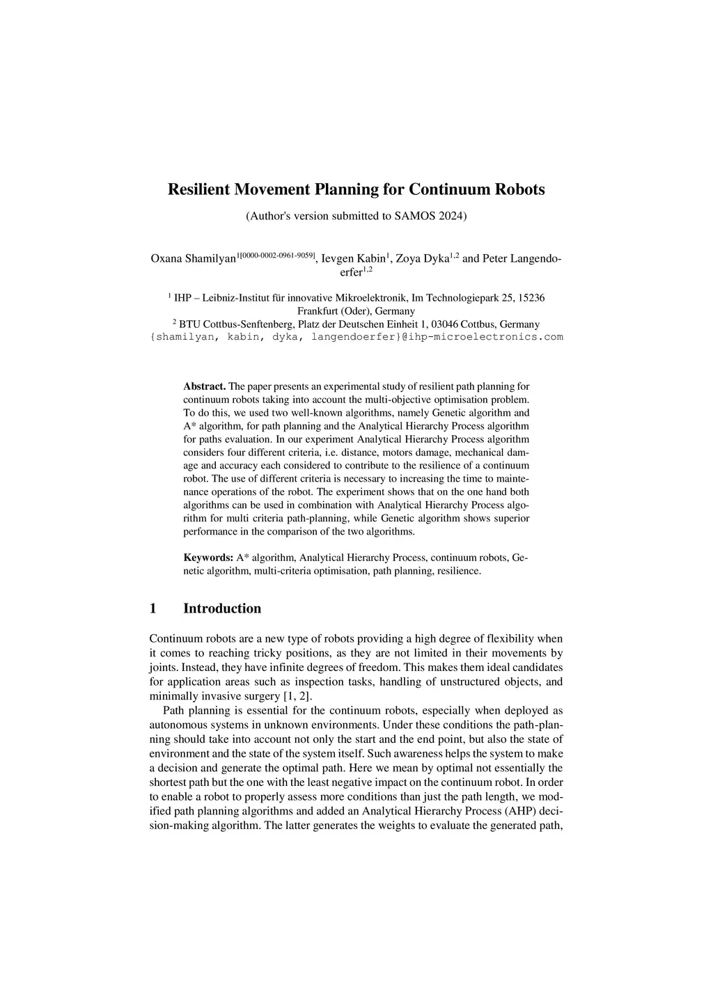 The paper presents an experimental study of resilient path planning for con-tinuum robots taking into account the multi-objective optimisation problem. To do this, we used two well-known algorithms, namely Genetic algorithm and A* algorithm, for path planning and the Analytical Hierarchy Process al-gorithm for paths evaluation. In our experiment Analytical Hierarchy Process algorithm considers four different criteria, i.e. distance, motors damage, me-chanical damage and accuracy each considered to contribute to the resilience of a continuum robot. The use of different criteria is necessary to increasing the time to maintenance operations of the robot. The experiment shows that on the one hand both algorithms can be used in combination with Analytical Hierarchy Process algorithm for multi criteria path-planning, while Genetic algorithm shows superior performance in the comparison of the two algo-rithms.