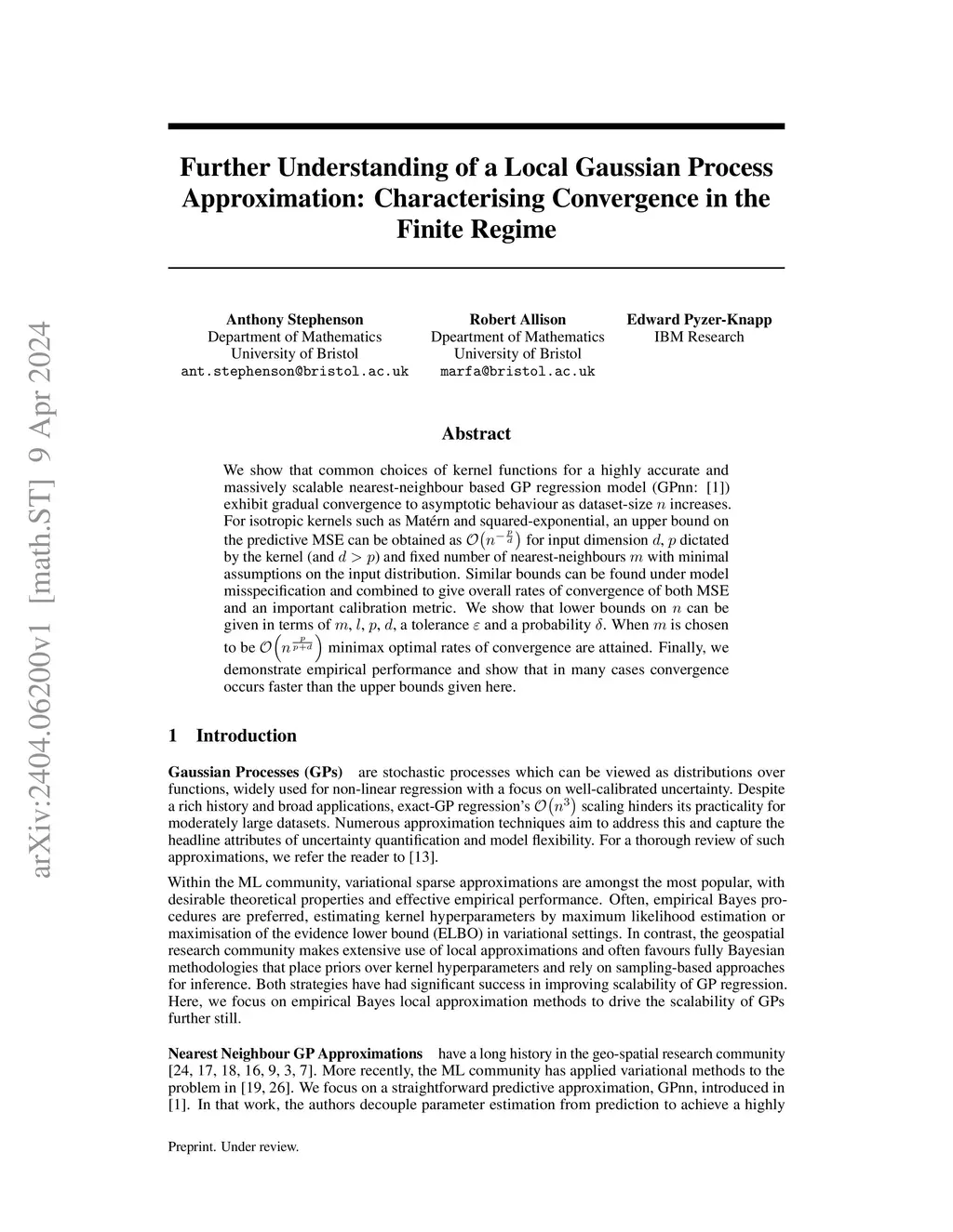 We show that common choices of kernel functions for a highly accurate and massively scalable nearest-neighbour based GP regression model (GPnn: \cite{GPnn}) exhibit gradual convergence to asymptotic behaviour as dataset-size increases. For isotropic kernels such as Mat\'{e}rn and squared-exponential, an upper bound on the predictive MSE can be obtained as for input dimension , dictated by the kernel (and ) and fixed number of nearest-neighbours with minimal assumptions on the input distribution. Similar bounds can be found under model misspecification and combined to give overall rates of convergence of both MSE and an important calibration metric. We show that lower bounds on can be given in terms of , , , , a tolerance and a probability . When is chosen to be minimax optimal rates of convergence are attained. Finally, we demonstrate empirical performance and show that in many cases convergence occurs faster than the upper bounds given here.