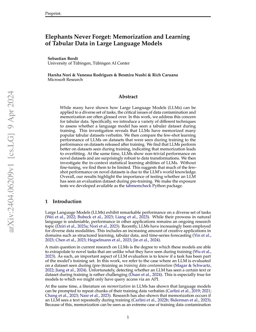 Elephants Never Forget: Memorization and Learning of Tabular Data in