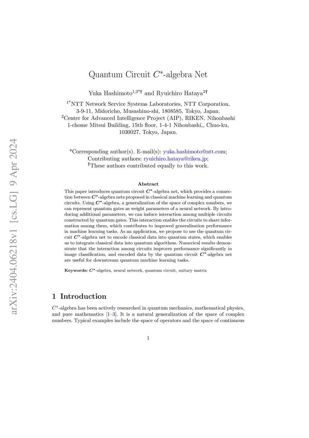 This paper introduces quantum circuit -algebra net, which provides a connection between -algebra nets proposed in classical machine learning and quantum circuits. Using -algebra, a generalization of the space of complex numbers, we can represent quantum gates as weight parameters of a neural network. By introducing additional parameters, we can induce interaction among multiple circuits constructed by quantum gates. This interaction enables the circuits to share information among them, which contributes to improved generalization performance in machine learning tasks. As an application, we propose to use the quantum circuit -algebra net to encode classical data into quantum states, which enables us to integrate classical data into quantum algorithms. Numerical results demonstrate that the interaction among circuits improves performance significantly in image classification, and encoded data by the quantum circuit -algebra net are useful for downstream quantum machine learning tasks.