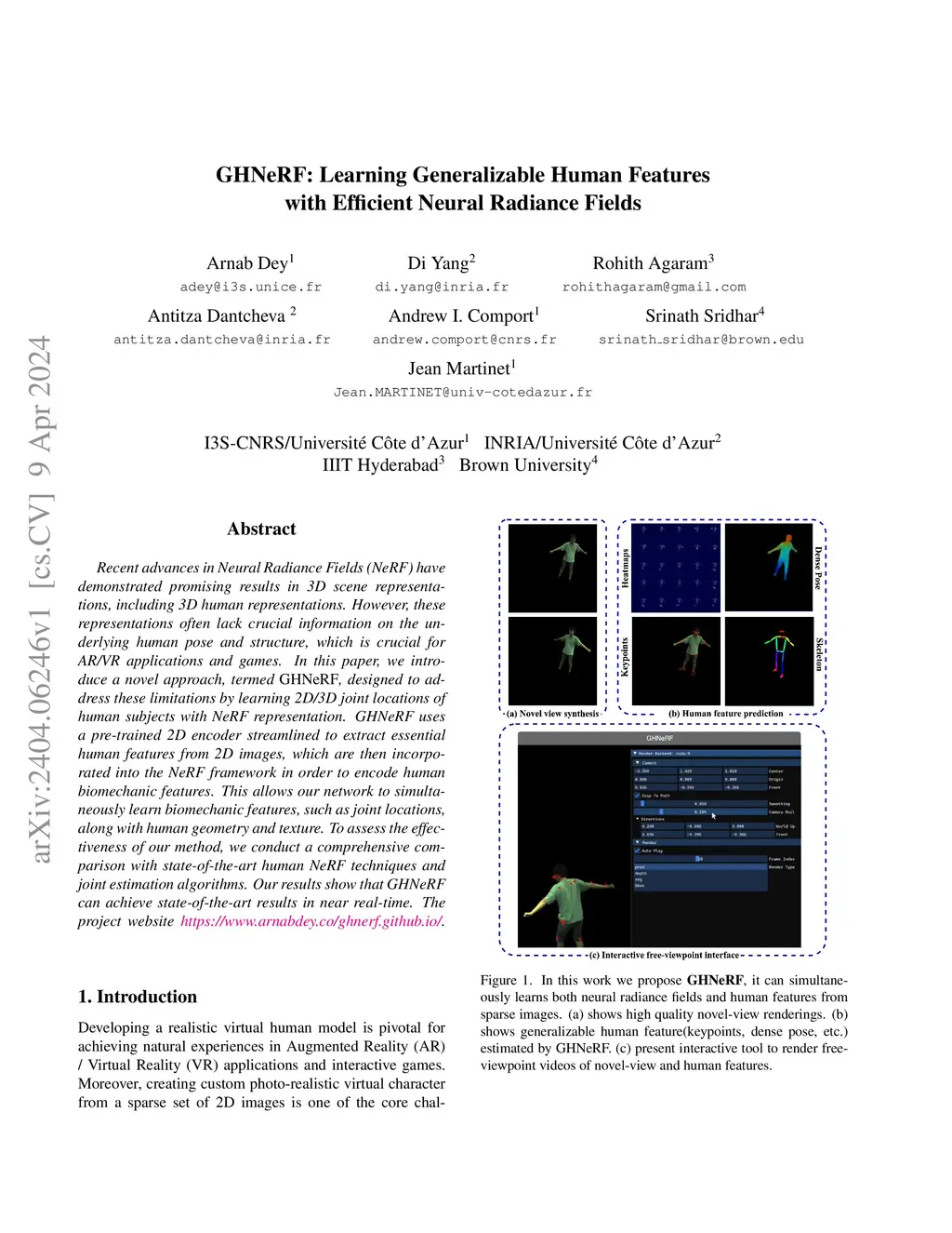 Recent advances in Neural Radiance Fields (NeRF) have demonstrated promising results in 3D scene representations, including 3D human representations. However, these representations often lack crucial information on the underlying human pose and structure, which is crucial for AR/VR applications and games. In this paper, we introduce a novel approach, termed GHNeRF, designed to address these limitations by learning 2D/3D joint locations of human subjects with NeRF representation. GHNeRF uses a pre-trained 2D encoder streamlined to extract essential human features from 2D images, which are then incorporated into the NeRF framework in order to encode human biomechanic features. This allows our network to simultaneously learn biomechanic features, such as joint locations, along with human geometry and texture. To assess the effectiveness of our method, we conduct a comprehensive comparison with state-of-the-art human NeRF techniques and joint estimation algorithms. Our results show that GHNeRF can achieve state-of-the-art results in near real-time.