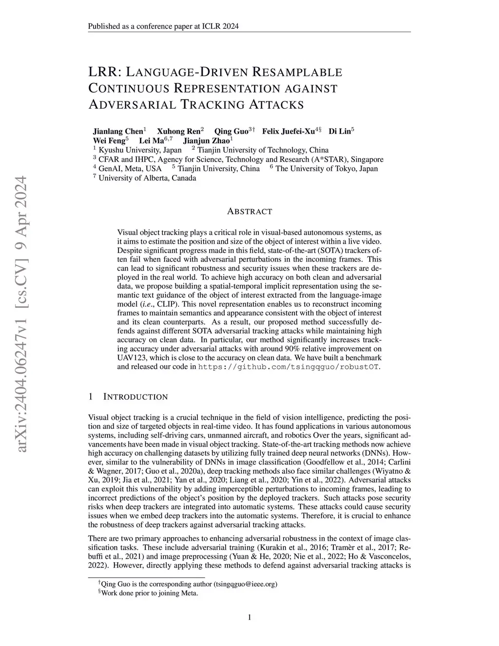 Visual object tracking plays a critical role in visual-based autonomous systems, as it aims to estimate the position and size of the object of interest within a live video. Despite significant progress made in this field, state-of-the-art (SOTA) trackers often fail when faced with adversarial perturbations in the incoming frames. This can lead to significant robustness and security issues when these trackers are deployed in the real world. To achieve high accuracy on both clean and adversarial data, we propose building a spatial-temporal continuous representation using the semantic text guidance of the object of interest. This novel continuous representation enables us to reconstruct incoming frames to maintain semantic and appearance consistency with the object of interest and its clean counterparts. As a result, our proposed method successfully defends against different SOTA adversarial tracking attacks while maintaining high accuracy on clean data. In particular, our method significantly increases tracking accuracy under adversarial attacks with around 90% relative improvement on UAV123, which is even higher than the accuracy on clean data.