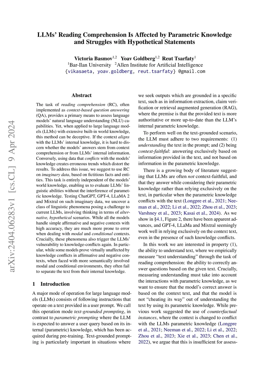 The task of reading comprehension (RC), often implemented as context-based question answering (QA), provides a primary means to assess language models' natural language understanding (NLU) capabilities. Yet, when applied to large language models (LLMs) with extensive built-in world knowledge, this method can be deceptive. If the context aligns with the LLMs' internal knowledge, it is hard to discern whether the models' answers stem from context comprehension or from LLMs' internal information. Conversely, using data that conflicts with the models' knowledge creates erroneous trends which distort the results. To address this issue, we suggest to use RC on imaginary data, based on fictitious facts and entities. This task is entirely independent of the models' world knowledge, enabling us to evaluate LLMs' linguistic abilities without the interference of parametric knowledge. Testing ChatGPT, GPT-4, LLaMA 2 and Mixtral on such imaginary data, we uncover a class of linguistic phenomena posing a challenge to current LLMs, involving thinking in terms of alternative, hypothetical scenarios. While all the models handle simple affirmative and negative contexts with high accuracy, they are much more prone to error when dealing with modal and conditional contexts. Crucially, these phenomena also trigger the LLMs' vulnerability to knowledge-conflicts again. In particular, while some models prove virtually unaffected by knowledge conflicts in affirmative and negative contexts, when faced with more semantically involved modal and conditional environments, they often fail to separate the text from their internal knowledge.