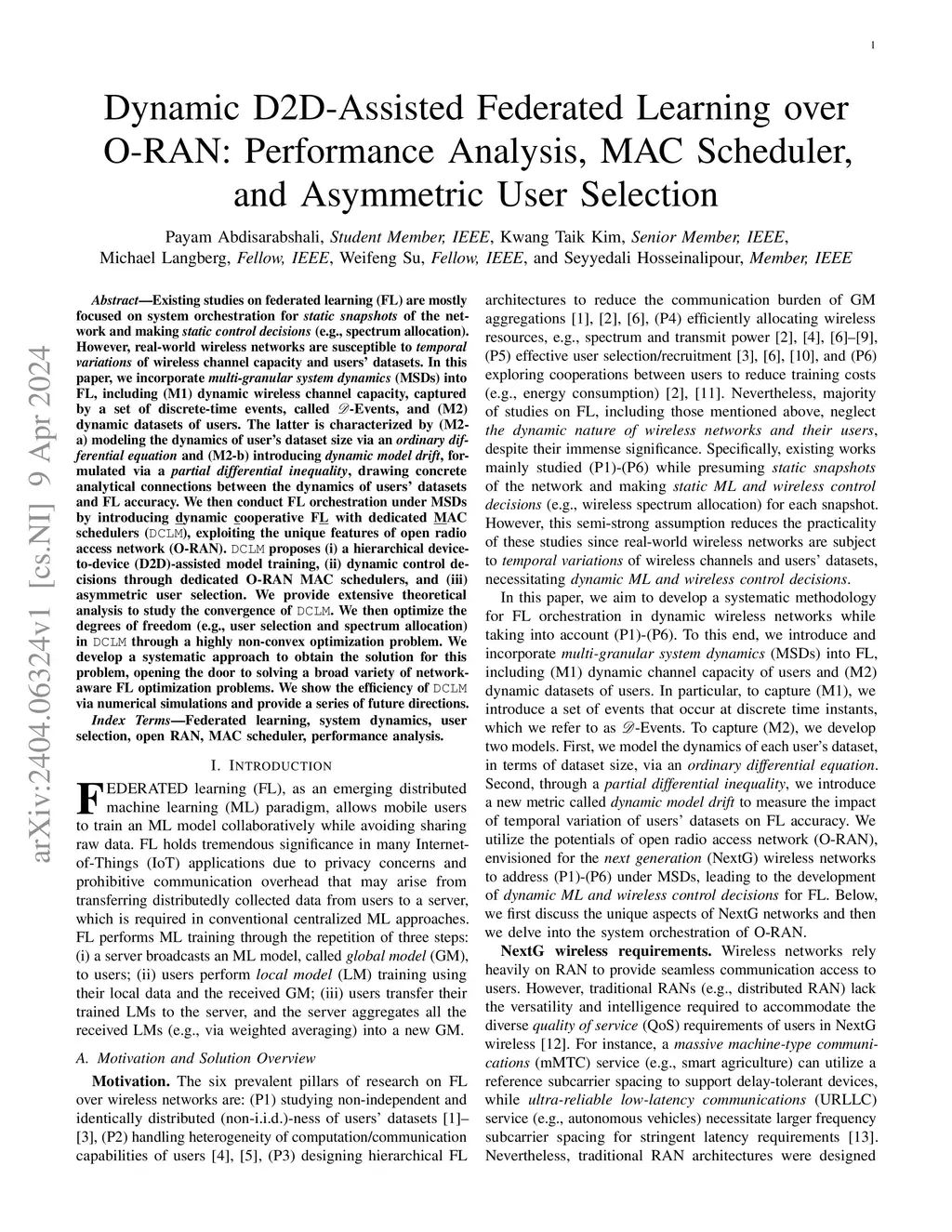 Existing studies on federated learning (FL) are mostly focused on system orchestration for static snapshots of the network and making static control decisions (e.g., spectrum allocation). However, real-world wireless networks are susceptible to temporal variations of wireless channel capacity and users' datasets. In this paper, we incorporate multi-granular system dynamics (MSDs) into FL, including (M1) dynamic wireless channel capacity, captured by a set of discrete-time events, called -Events, and (M2) dynamic datasets of users. The latter is characterized by (M2-a) modeling the dynamics of user's dataset size via an ordinary differential equation and (M2-b) introducing dynamic model drift}, formulated via a partial differential inequality} drawing concrete analytical connections between the dynamics of users' datasets and FL accuracy. We then conduct FL orchestration under MSDs by introducing dynamic cooperative FL with dedicated MAC schedulers (DCLM), exploiting the unique features of open radio access network (O-RAN). DCLM proposes (i) a hierarchical device-to-device (D2D)-assisted model training, (ii) dynamic control decisions through dedicated O-RAN MAC schedulers, and (iii) asymmetric user selection. We provide extensive theoretical analysis to study the convergence of DCLM. We then optimize the degrees of freedom (e.g., user selection and spectrum allocation) in DCLM through a highly non-convex optimization problem. We develop a systematic approach to obtain the solution for this problem, opening the door to solving a broad variety of network-aware FL optimization problems. We show the efficiency of DCLM via numerical simulations and provide a series of future directions.