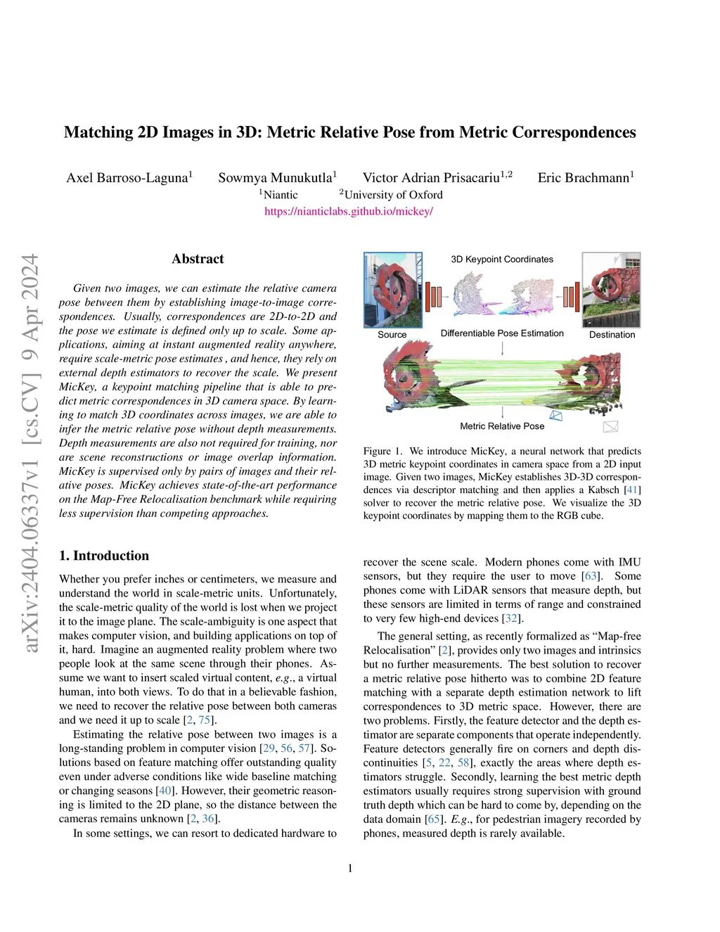 Given two images, we can estimate the relative camera pose between them by establishing image-to-image correspondences. Usually, correspondences are 2D-to-2D and the pose we estimate is defined only up to scale. Some applications, aiming at instant augmented reality anywhere, require scale-metric pose estimates, and hence, they rely on external depth estimators to recover the scale. We present MicKey, a keypoint matching pipeline that is able to predict metric correspondences in 3D camera space. By learning to match 3D coordinates across images, we are able to infer the metric relative pose without depth measurements. Depth measurements are also not required for training, nor are scene reconstructions or image overlap information. MicKey is supervised only by pairs of images and their relative poses. MicKey achieves state-of-the-art performance on the Map-Free Relocalisation benchmark while requiring less supervision than competing approaches.