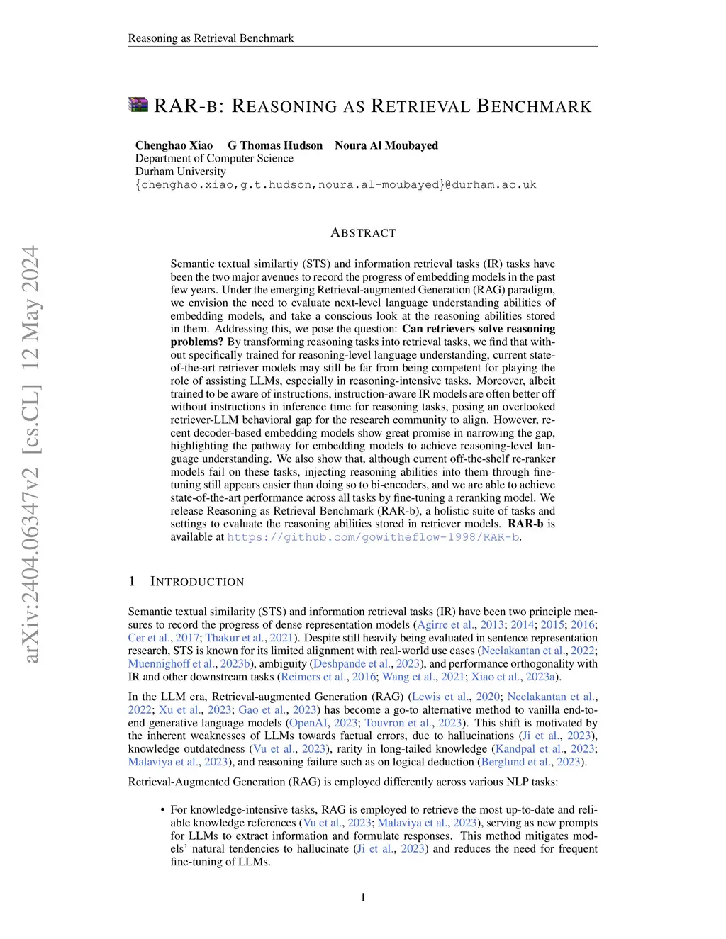 RAR-b: Reasoning as Retrieval Benchmark