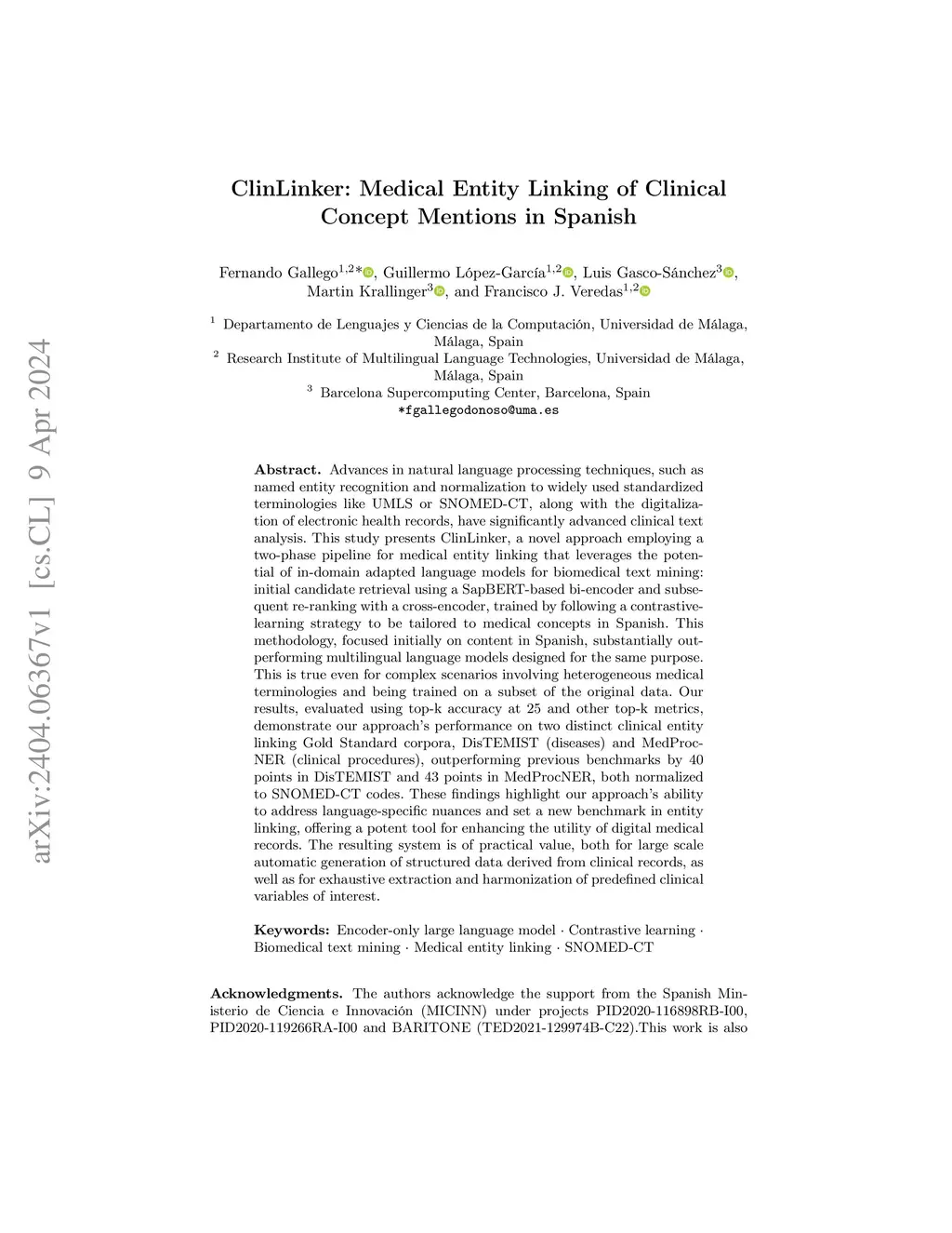 Advances in natural language processing techniques, such as named entity recognition and normalization to widely used standardized terminologies like UMLS or SNOMED-CT, along with the digitalization of electronic health records, have significantly advanced clinical text analysis. This study presents ClinLinker, a novel approach employing a two-phase pipeline for medical entity linking that leverages the potential of in-domain adapted language models for biomedical text mining: initial candidate retrieval using a SapBERT-based bi-encoder and subsequent re-ranking with a cross-encoder, trained by following a contrastive-learning strategy to be tailored to medical concepts in Spanish. This methodology, focused initially on content in Spanish, substantially outperforming multilingual language models designed for the same purpose. This is true even for complex scenarios involving heterogeneous medical terminologies and being trained on a subset of the original data. Our results, evaluated using top-k accuracy at 25 and other top-k metrics, demonstrate our approach's performance on two distinct clinical entity linking Gold Standard corpora, DisTEMIST (diseases) and MedProcNER (clinical procedures), outperforming previous benchmarks by 40 points in DisTEMIST and 43 points in MedProcNER, both normalized to SNOMED-CT codes. These findings highlight our approach's ability to address language-specific nuances and set a new benchmark in entity linking, offering a potent tool for enhancing the utility of digital medical records. The resulting system is of practical value, both for large scale automatic generation of structured data derived from clinical records, as well as for exhaustive extraction and harmonization of predefined clinical variables of interest.