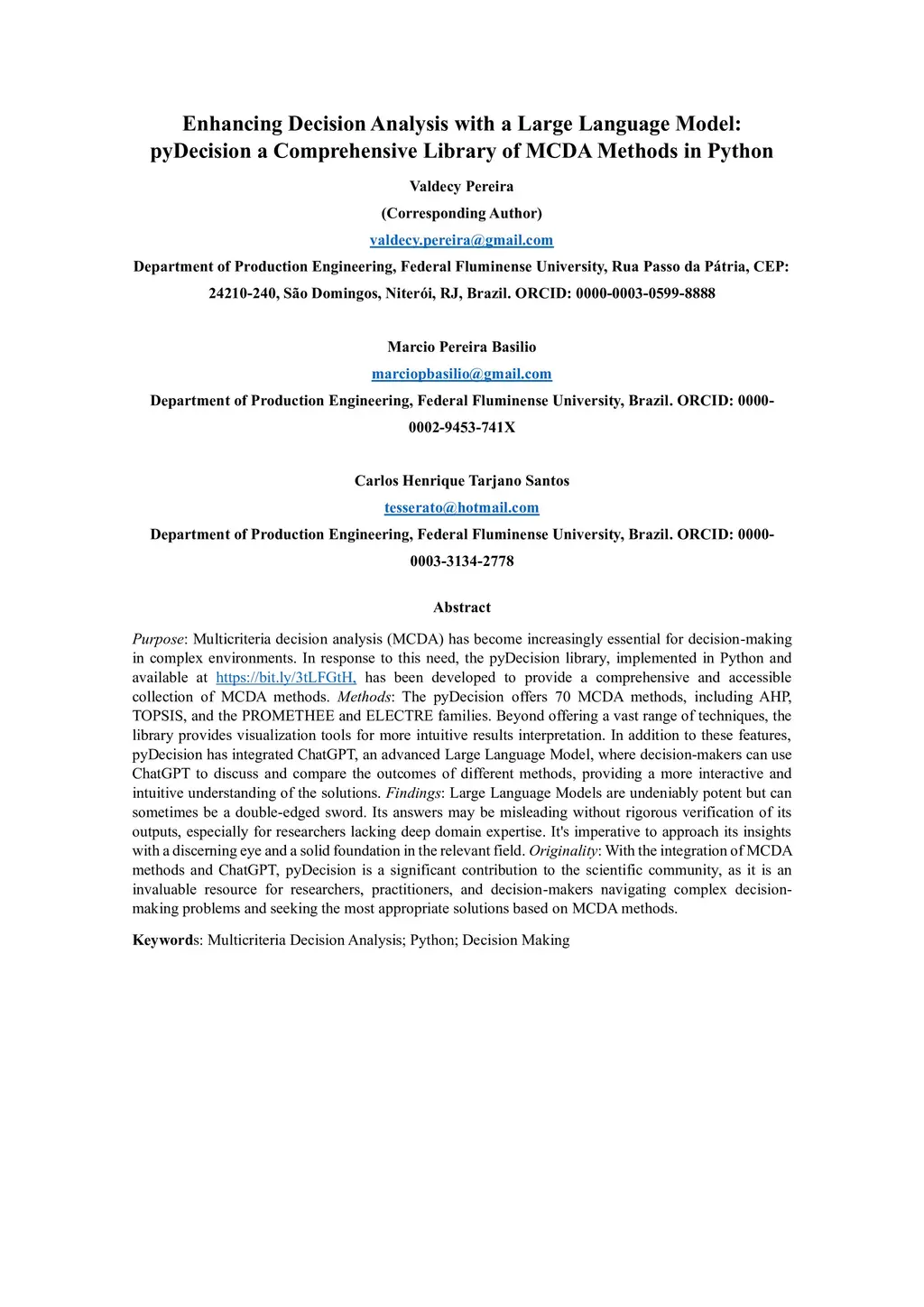 Purpose: Multicriteria decision analysis (MCDA) has become increasingly essential for decision-making in complex environments. In response to this need, the pyDecision library, implemented in Python and available at https://bit.ly/3tLFGtH, has been developed to provide a comprehensive and accessible collection of MCDA methods. Methods: The pyDecision offers 70 MCDA methods, including AHP, TOPSIS, and the PROMETHEE and ELECTRE families. Beyond offering a vast range of techniques, the library provides visualization tools for more intuitive results interpretation. In addition to these features, pyDecision has integrated ChatGPT, an advanced Large Language Model, where decision-makers can use ChatGPT to discuss and compare the outcomes of different methods, providing a more interactive and intuitive understanding of the solutions. Findings: Large Language Models are undeniably potent but can sometimes be a double-edged sword. Its answers may be misleading without rigorous verification of its outputs, especially for researchers lacking deep domain expertise. It's imperative to approach its insights with a discerning eye and a solid foundation in the relevant field. Originality: With the integration of MCDA methods and ChatGPT, pyDecision is a significant contribution to the scientific community, as it is an invaluable resource for researchers, practitioners, and decision-makers navigating complex decision-making problems and seeking the most appropriate solutions based on MCDA methods.