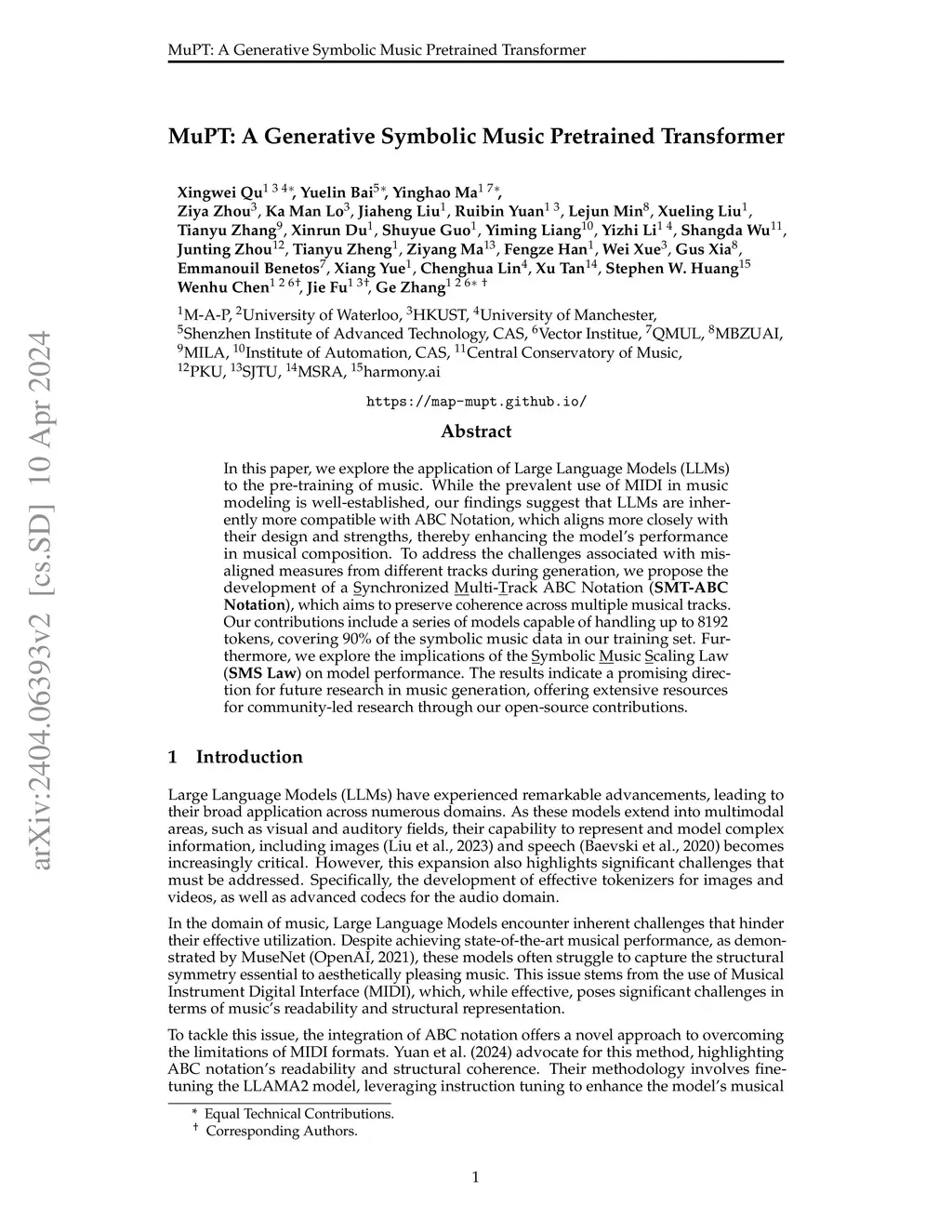 In this paper, we explore the application of Large Language Models (LLMs) to the pre-training of music. While the prevalent use of MIDI in music modeling is well-established, our findings suggest that LLMs are inherently more compatible with ABC Notation, which aligns more closely with their design and strengths, thereby enhancing the model's performance in musical composition. To address the challenges associated with misaligned measures from different tracks during generation, we propose the development of a Synchronized Multi-Track ABC Notation (SMT-ABC Notation), which aims to preserve coherence across multiple musical tracks. Our contributions include a series of models capable of handling up to 8192 tokens, covering 90% of the symbolic music data in our training set. Furthermore, we explore the implications of the Symbolic Music Scaling Law (SMS Law) on model performance. The results indicate a promising direction for future research in music generation, offering extensive resources for community-led research through our open-source contributions.