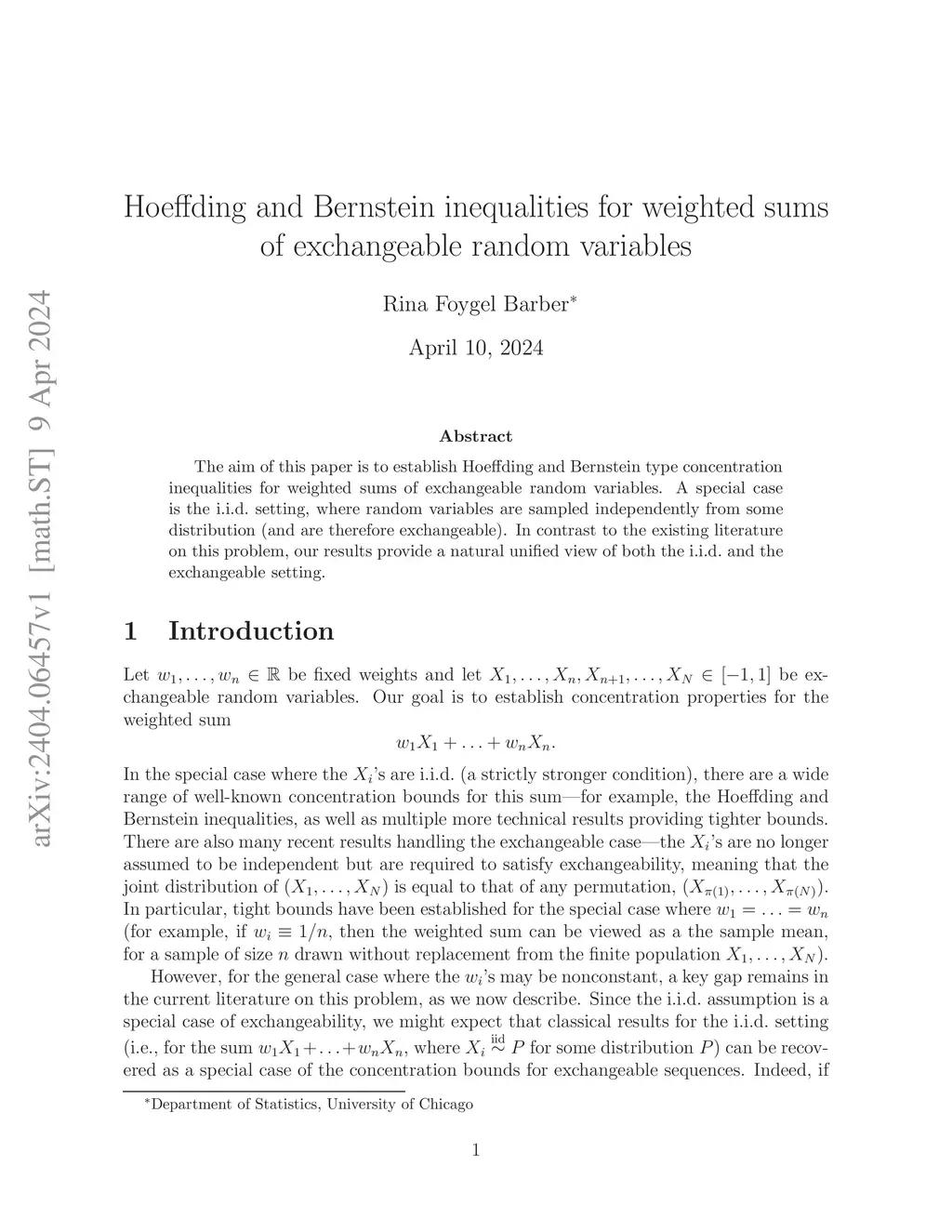 The aim of this paper is to establish Hoeffding and Bernstein type concentration inequalities for weighted sums of exchangeable random variables. A special case is the i.i.d. setting, where random variables are sampled independently from some distribution (and are therefore exchangeable). In contrast to the existing literature on this problem, our results provide a natural unified view of both the i.i.d. and the exchangeable setting.