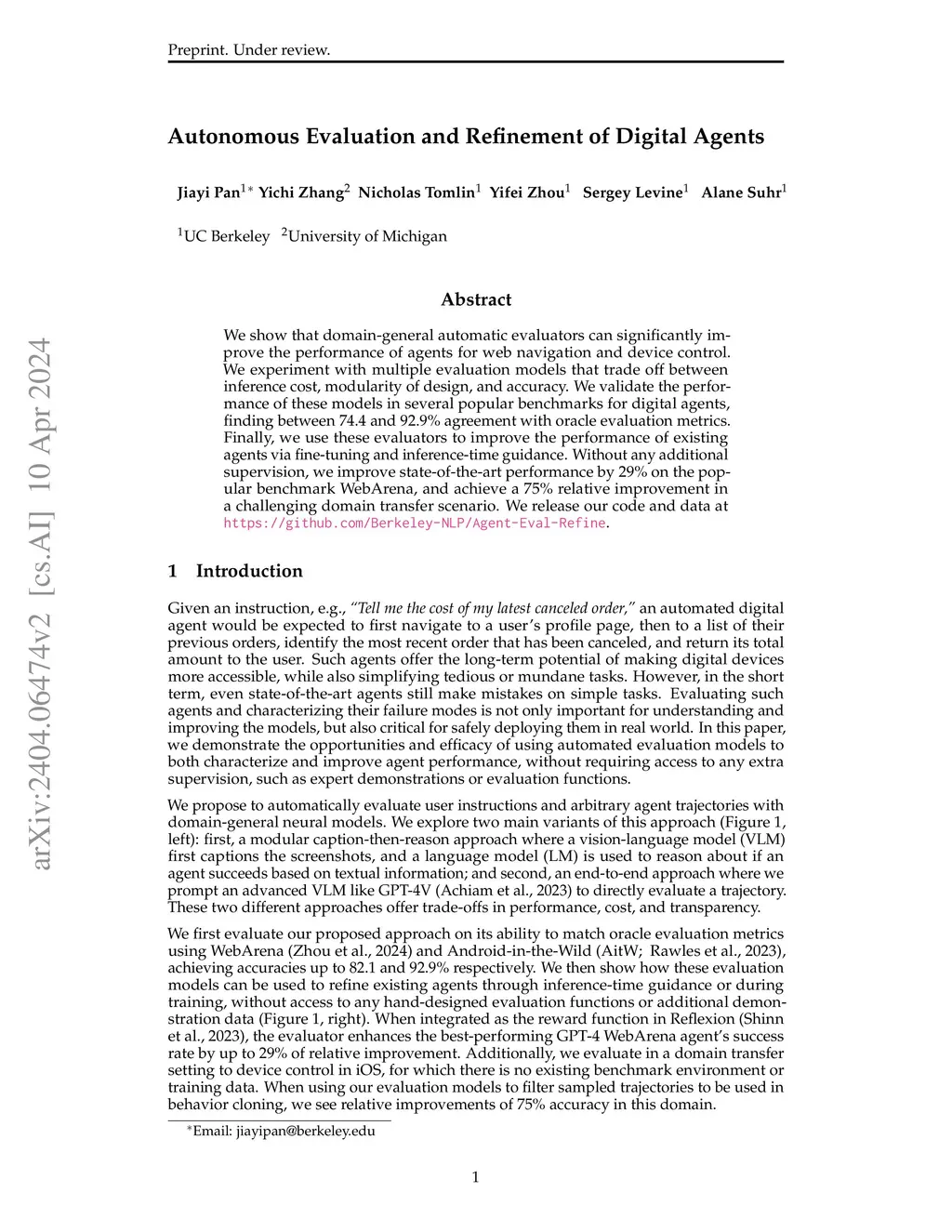 We show that domain-general automatic evaluators can significantly improve the performance of agents for web navigation and device control. We experiment with multiple evaluation models that trade off between inference cost, modularity of design, and accuracy. We validate the performance of these models in several popular benchmarks for digital agents, finding between 74.4 and 92.9% agreement with oracle evaluation metrics. Finally, we use these evaluators to improve the performance of existing agents via fine-tuning and inference-time guidance. Without any additional supervision, we improve state-of-the-art performance by 29% on the popular benchmark WebArena, and achieve a 75% relative improvement in a challenging domain transfer scenario.