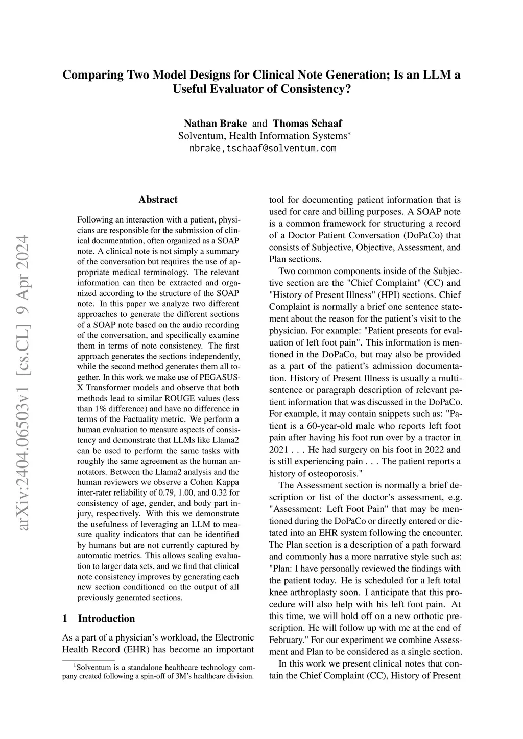 Following an interaction with a patient, physicians are responsible for the submission of clinical documentation, often organized as a SOAP note. A clinical note is not simply a summary of the conversation but requires the use of appropriate medical terminology. The relevant information can then be extracted and organized according to the structure of the SOAP note. In this paper we analyze two different approaches to generate the different sections of a SOAP note based on the audio recording of the conversation, and specifically examine them in terms of note consistency. The first approach generates the sections independently, while the second method generates them all together. In this work we make use of PEGASUS-X Transformer models and observe that both methods lead to similar ROUGE values (less than 1% difference) and have no difference in terms of the Factuality metric. We perform a human evaluation to measure aspects of consistency and demonstrate that LLMs like Llama2 can be used to perform the same tasks with roughly the same agreement as the human annotators. Between the Llama2 analysis and the human reviewers we observe a Cohen Kappa inter-rater reliability of 0.79, 1.00, and 0.32 for consistency of age, gender, and body part injury, respectively. With this we demonstrate the usefulness of leveraging an LLM to measure quality indicators that can be identified by humans but are not currently captured by automatic metrics. This allows scaling evaluation to larger data sets, and we find that clinical note consistency improves by generating each new section conditioned on the output of all previously generated sections.