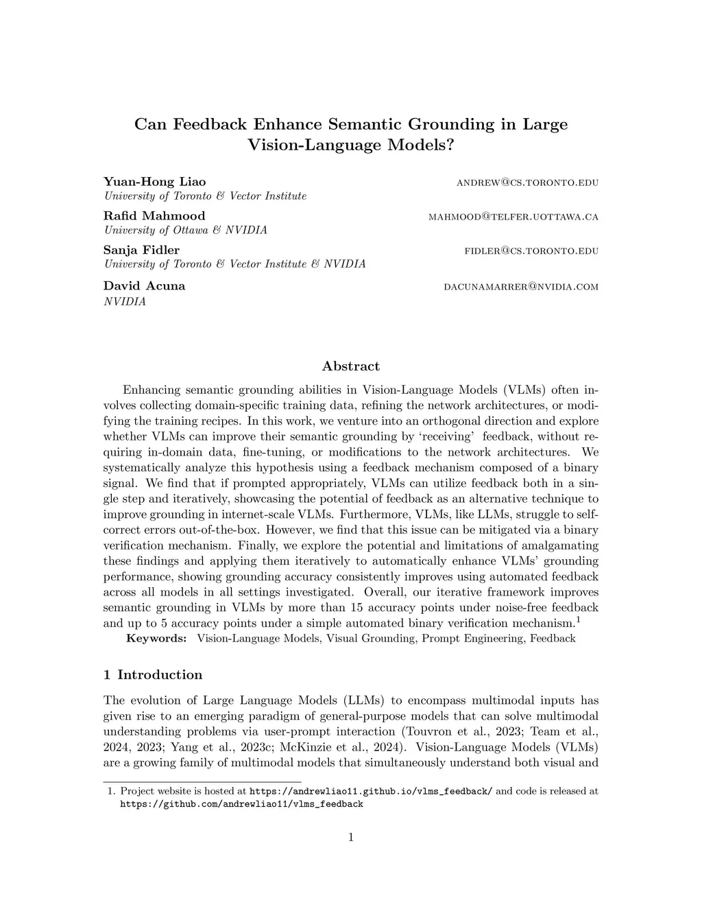 Enhancing semantic grounding abilities in Vision-Language Models (VLMs) often involves collecting domain-specific training data, refining the network architectures, or modifying the training recipes. In this work, we venture into an orthogonal direction and explore whether VLMs can improve their semantic grounding by "receiving" feedback, without requiring in-domain data, fine-tuning, or modifications to the network architectures. We systematically analyze this hypothesis using a feedback mechanism composed of a binary signal. We find that if prompted appropriately, VLMs can utilize feedback both in a single step and iteratively, showcasing the potential of feedback as an alternative technique to improve grounding in internet-scale VLMs. Furthermore, VLMs, like LLMs, struggle to self-correct errors out-of-the-box. However, we find that this issue can be mitigated via a binary verification mechanism. Finally, we explore the potential and limitations of amalgamating these findings and applying them iteratively to automatically enhance VLMs' grounding performance, showing grounding accuracy consistently improves using automated feedback across all models in all settings investigated. Overall, our iterative framework improves semantic grounding in VLMs by more than 15 accuracy points under noise-free feedback and up to 5 accuracy points under a simple automated binary verification mechanism. The project website is hosted atthis https URL