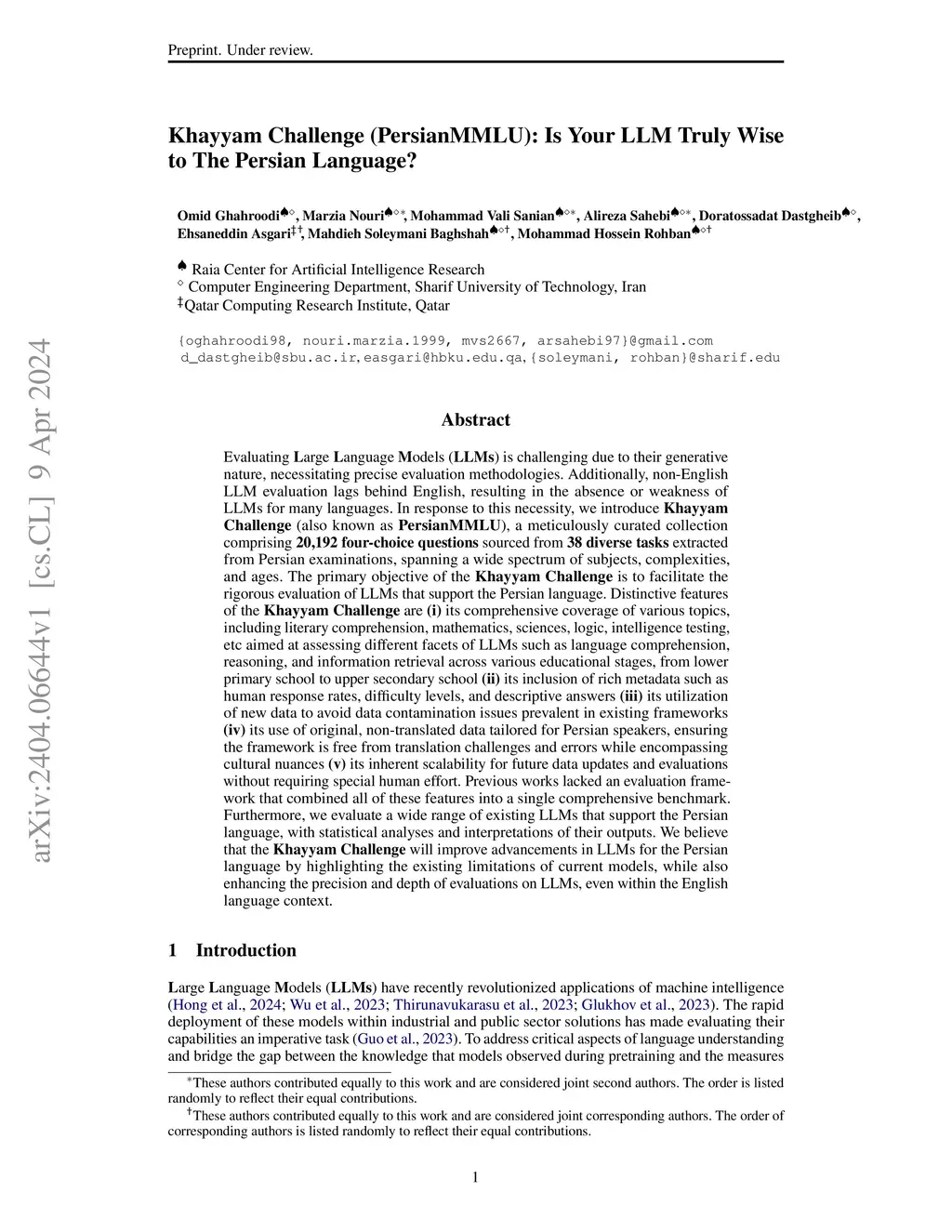 Evaluating Large Language Models (LLMs) is challenging due to their generative nature, necessitating precise evaluation methodologies. Additionally, non-English LLM evaluation lags behind English, resulting in the absence or weakness of LLMs for many languages. In response to this necessity, we introduce Khayyam Challenge (also known as PersianMMLU), a meticulously curated collection comprising 20,192 four-choice questions sourced from 38 diverse tasks extracted from Persian examinations, spanning a wide spectrum of subjects, complexities, and ages. The primary objective of the Khayyam Challenge is to facilitate the rigorous evaluation of LLMs that support the Persian language. Distinctive features of the Khayyam Challenge are (i) its comprehensive coverage of various topics, including literary comprehension, mathematics, sciences, logic, intelligence testing, etc., aimed at assessing different facets of LLMs such as language comprehension, reasoning, and information retrieval across various educational stages, from lower primary school to upper secondary school (ii) its inclusion of rich metadata such as human response rates, difficulty levels, and descriptive answers (iii) its utilization of new data to avoid data contamination issues prevalent in existing frameworks (iv) its use of original, non-translated data tailored for Persian speakers, ensuring the framework is free from translation challenges and errors while encompassing cultural nuances (v) its inherent scalability for future data updates and evaluations without requiring special human effort. Previous works lacked an evaluation framework that combined all of these features into a single comprehensive benchmark. Furthermore, we evaluate a wide range of existing LLMs that support the Persian language, with statistical analyses and interpretations of their outputs.