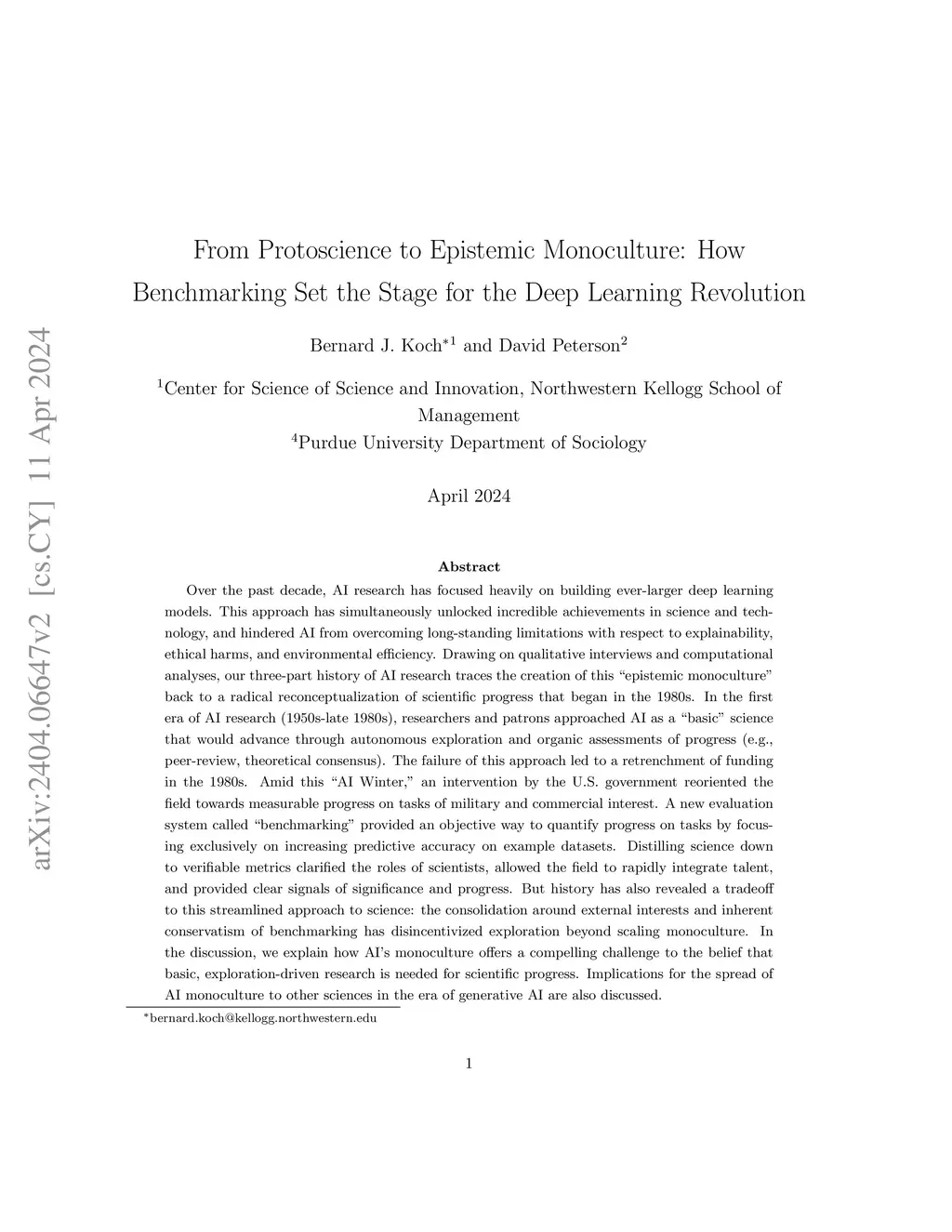 Over the past decade, AI research has focused heavily on building ever-larger deep learning models. This approach has simultaneously unlocked incredible achievements in science and technology, and hindered AI from overcoming long-standing limitations with respect to explainability, ethical harms, and environmental efficiency. Drawing on qualitative interviews and computational analyses, our three-part history of AI research traces the creation of this "epistemic monoculture" back to a radical reconceptualization of scientific progress that began in the late 1980s. In the first era of AI research (1950s-late 1980s), researchers and patrons approached AI as a "basic" science that would advance through autonomous exploration and organic assessments of progress (e.g., peer-review, theoretical consensus). The failure of this approach led to a retrenchment of funding in the 1980s. Amid this "AI Winter," an intervention by the U.S. government reoriented the field towards measurable progress on tasks of military and commercial interest. A new evaluation system called "benchmarking" provided an objective way to quantify progress on tasks by focusing exclusively on increasing predictive accuracy on example datasets. Distilling science down to verifiable metrics clarified the roles of scientists, allowed the field to rapidly integrate talent, and provided clear signals of significance and progress. But history has also revealed a tradeoff to this streamlined approach to science: the consolidation around external interests and inherent conservatism of benchmarking has disincentivized exploration beyond scaling monoculture. In the discussion, we explain how AI's monoculture offers a compelling challenge to the belief that basic, exploration-driven research is needed for scientific progress. Implications for the spread of AI monoculture to other sciences in the era of generative AI are also discussed.