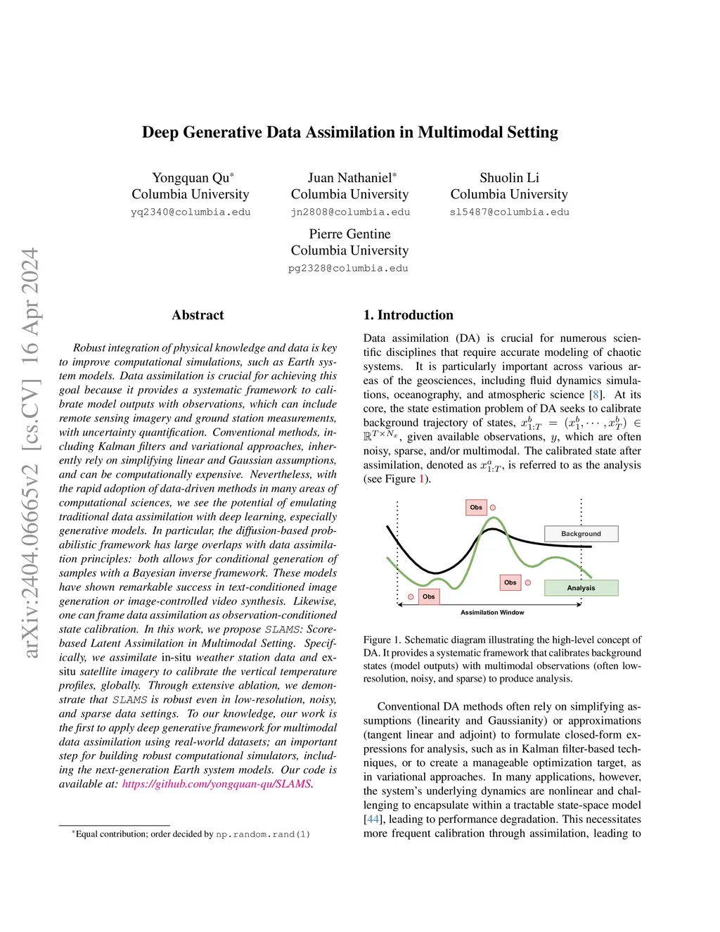 Robust integration of physical knowledge and data is key to improve computational simulations, such as Earth system models. Data assimilation is crucial for achieving this goal because it provides a systematic framework to calibrate model outputs with observations, which can include remote sensing imagery and ground station measurements, with uncertainty quantification. Conventional methods, including Kalman filters and variational approaches, inherently rely on simplifying linear and Gaussian assumptions, and can be computationally expensive. Nevertheless, with the rapid adoption of data-driven methods in many areas of computational sciences, we see the potential of emulating traditional data assimilation with deep learning, especially generative models. In particular, the diffusion-based probabilistic framework has large overlaps with data assimilation principles: both allows for conditional generation of samples with a Bayesian inverse framework. These models have shown remarkable success in text-conditioned image generation or image-controlled video synthesis. Likewise, one can frame data assimilation as observation-conditioned state calibration. In this work, we propose SLAMS: Score-based Latent Assimilation in Multimodal Setting. Specifically, we assimilate in-situ weather station data and ex-situ satellite imagery to calibrate the vertical temperature profiles, globally. Through extensive ablation, we demonstrate that SLAMS is robust even in low-resolution, noisy, and sparse data settings. To our knowledge, our work is the first to apply deep generative framework for multimodal data assimilation using real-world datasets; an important step for building robust computational simulators, including the next-generation Earth system models. Our code is available at: https://github.com/yongquan-qu/SLAMS