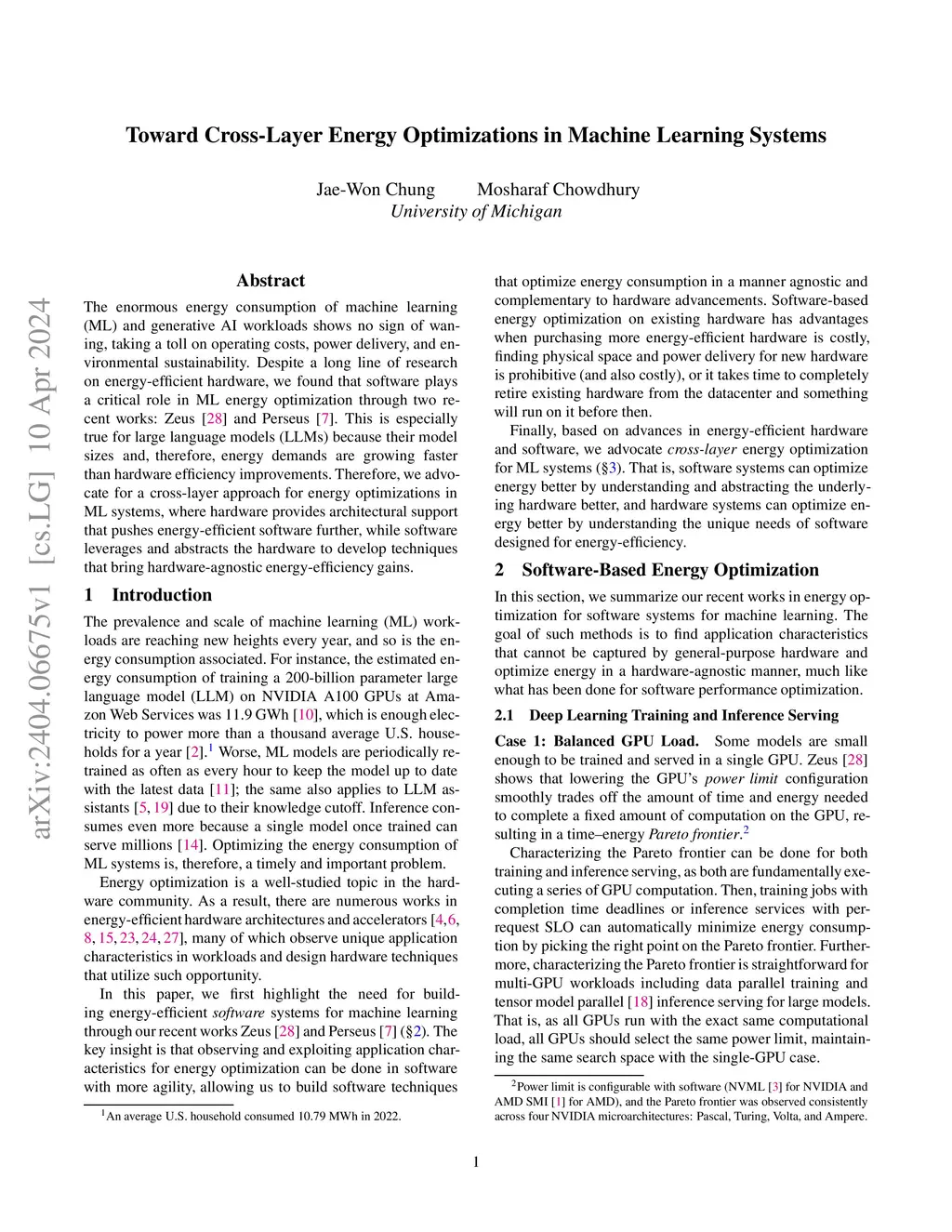 The enormous energy consumption of machine learning (ML) and generative AI workloads shows no sign of waning, taking a toll on operating costs, power delivery, and environmental sustainability. Despite a long line of research on energy-efficient hardware, we found that software plays a critical role in ML energy optimization through two recent works: Zeus and Perseus. This is especially true for large language models (LLMs) because their model sizes and, therefore, energy demands are growing faster than hardware efficiency improvements. Therefore, we advocate for a cross-layer approach for energy optimizations in ML systems, where hardware provides architectural support that pushes energy-efficient software further, while software leverages and abstracts the hardware to develop techniques that bring hardware-agnostic energy-efficiency gains.