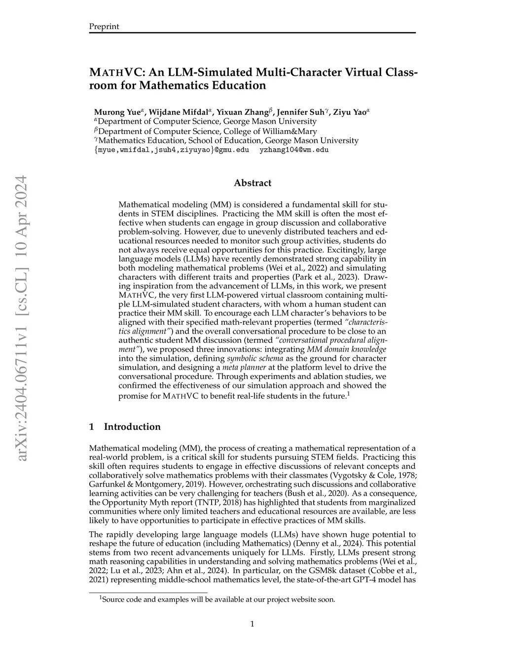 MathVC: An LLM-Simulated Multi-Character Virtual Classroom for Mathematics Education