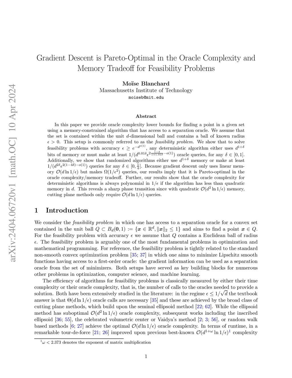 In this paper we provide oracle complexity lower bounds for finding a point in a given set using a memory-constrained algorithm that has access to a separation oracle. We assume that the set is contained within the unit -dimensional ball and contains a ball of known radius . This setup is commonly referred to as the feasibility problem. We show that to solve feasibility problems with accuracy , any deterministic algorithm either uses bits of memory or must make at least oracle queries, for any . Additionally, we show that randomized algorithms either use memory or make at least queries for any . Because gradient descent only uses linear memory but makes queries, our results imply that it is Pareto-optimal in the oracle complexity/memory tradeoff. Further, our results show that the oracle complexity for deterministic algorithms is always polynomial in if the algorithm has less than quadratic memory in . This reveals a sharp phase transition since with quadratic memory, cutting plane methods only require queries.