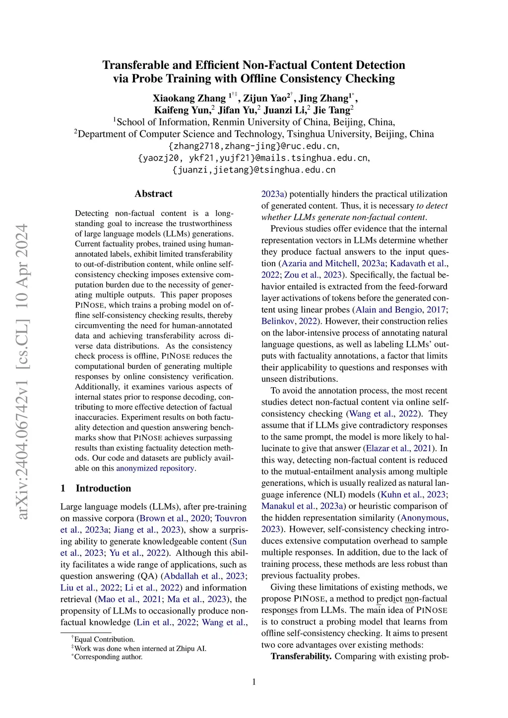 Detecting non-factual content is a longstanding goal to increase the trustworthiness of large language models (LLMs) generations. Current factuality probes, trained using humanannotated labels, exhibit limited transferability to out-of-distribution content, while online selfconsistency checking imposes extensive computation burden due to the necessity of generating multiple outputs. This paper proposes PINOSE, which trains a probing model on offline self-consistency checking results, thereby circumventing the need for human-annotated data and achieving transferability across diverse data distributions. As the consistency check process is offline, PINOSE reduces the computational burden of generating multiple responses by online consistency verification. Additionally, it examines various aspects of internal states prior to response decoding, contributing to more effective detection of factual inaccuracies. Experiment results on both factuality detection and question answering benchmarks show that PINOSE achieves surpassing results than existing factuality detection methods. Our code and datasets are publicly available on this anonymized repository.