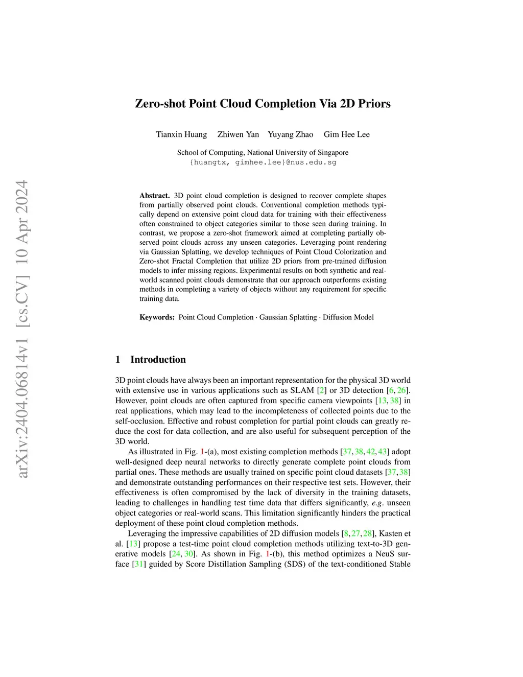 3D point clouds directly collected from objects through sensors are often incomplete due to self-occlusion. Conventional methods for completing these partial point clouds rely on manually organized training sets and are usually limited to object categories seen during training. In this work, we propose a test-time framework for completing partial point clouds across unseen categories without any requirement for training. Leveraging point rendering via Gaussian Splatting, we develop techniques of Partial Gaussian Initialization, Zero-shot Fractal Completion, and Point Cloud Extraction that utilize priors from pre-trained 2D diffusion models to infer missing regions and extract uniform completed point clouds. Experimental results on both synthetic and real-world scanned point clouds demonstrate that our approach outperforms existing methods in completing a variety of objects. Our project page is at \url{this https URL}.