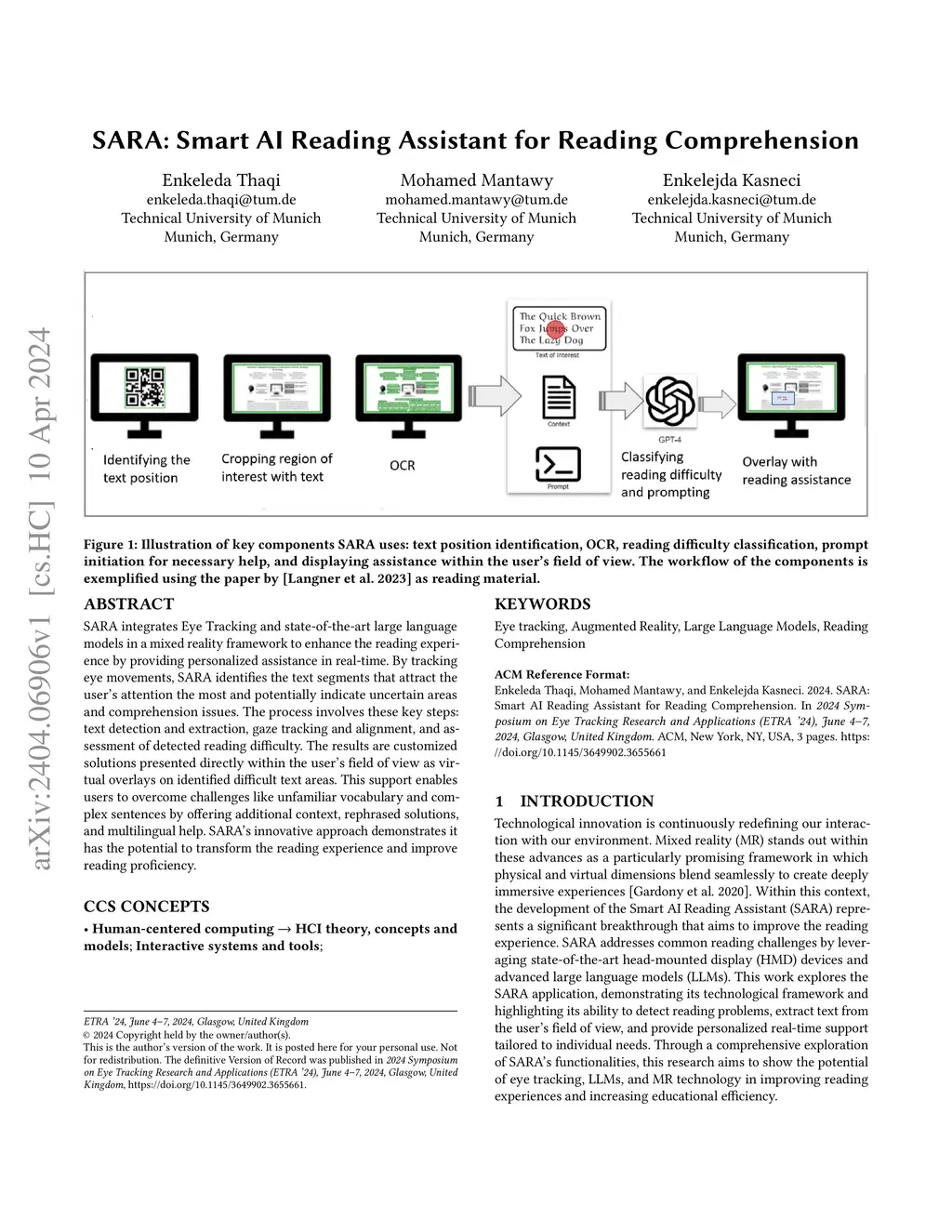 SARA integrates Eye Tracking and state-of-the-art large language models in a mixed reality framework to enhance the reading experience by providing personalized assistance in real-time. By tracking eye movements, SARA identifies the text segments that attract the user's attention the most and potentially indicate uncertain areas and comprehension issues. The process involves these key steps: text detection and extraction, gaze tracking and alignment, and assessment of detected reading difficulty. The results are customized solutions presented directly within the user's field of view as virtual overlays on identified difficult text areas. This support enables users to overcome challenges like unfamiliar vocabulary and complex sentences by offering additional context, rephrased solutions, and multilingual help. SARA's innovative approach demonstrates it has the potential to transform the reading experience and improve reading proficiency.