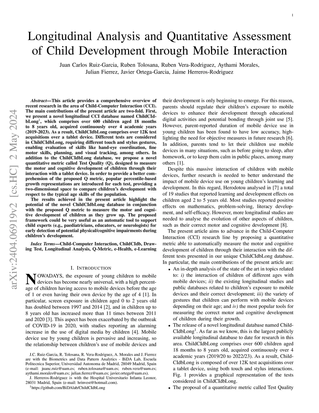 This article provides a comprehensive overview of recent research in the area of Child-Computer Interaction (CCI). The main contributions of the present article are two-fold. First, we present a novel longitudinal CCI database named ChildCIdbLong, which comprises over 600 children aged 18 months to 8 years old, acquired continuously over 4 academic years (2019-2023). As a result, ChildCIdbLong comprises over 12K test acquisitions over a tablet device. Different tests are considered in ChildCIdbLong, requiring different touch and stylus gestures, enabling evaluation of skills like hand-eye coordination, fine motor skills, planning, and visual tracking, among others. In addition to the ChildCIdbLong database, we propose a novel quantitative metric called Test Quality (Q), designed to measure the motor and cognitive development of children through their interaction with a tablet device. In order to provide a better comprehension of the proposed Q metric, popular percentile-based growth representations are introduced for each test, providing a two-dimensional space to compare children's development with respect to the typical age skills of the population. The results achieved in the present article highlight the potential of the novel ChildCIdbLong database in conjunction with the proposed Q metric to measure the motor and cognitive development of children as they grow up. The proposed framework could be very useful as an automatic tool to support child experts (e.g., paediatricians, educators, or neurologists) for early detection of potential physical/cognitive impairments during children's development.