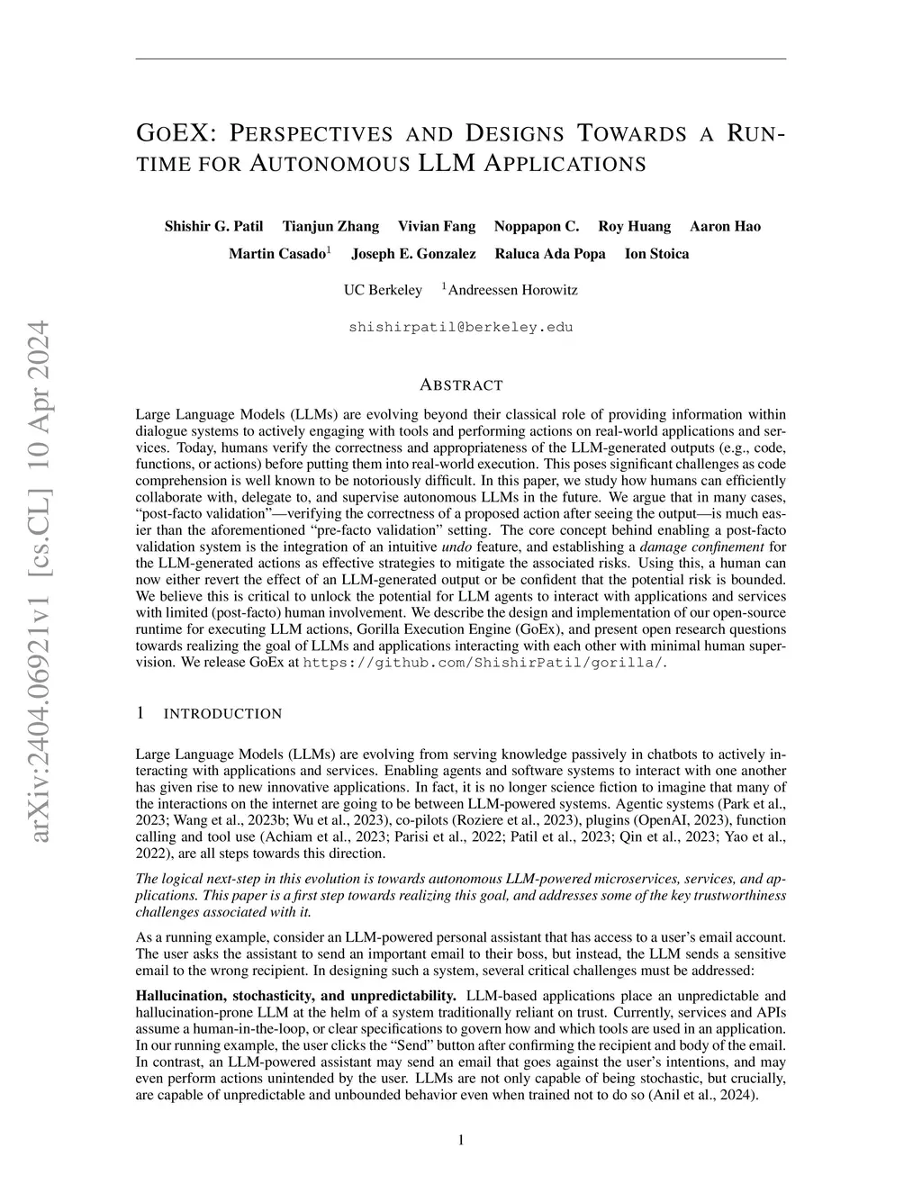 Large Language Models (LLMs) are evolving beyond their classical role of providing information within dialogue systems to actively engaging with tools and performing actions on real-world applications and services. Today, humans verify the correctness and appropriateness of the LLM-generated outputs (e.g., code, functions, or actions) before putting them into real-world execution. This poses significant challenges as code comprehension is well known to be notoriously difficult. In this paper, we study how humans can efficiently collaborate with, delegate to, and supervise autonomous LLMs in the future. We argue that in many cases, "post-facto validation" - verifying the correctness of a proposed action after seeing the output - is much easier than the aforementioned "pre-facto validation" setting. The core concept behind enabling a post-facto validation system is the integration of an intuitive undo feature, and establishing a damage confinement for the LLM-generated actions as effective strategies to mitigate the associated risks. Using this, a human can now either revert the effect of an LLM-generated output or be confident that the potential risk is bounded. We believe this is critical to unlock the potential for LLM agents to interact with applications and services with limited (post-facto) human involvement. We describe the design and implementation of our open-source runtime for executing LLM actions, Gorilla Execution Engine (GoEX), and present open research questions towards realizing the goal of LLMs and applications interacting with each other with minimal human supervision. We release GoEX at https://github.com/ShishirPatil/gorilla/.