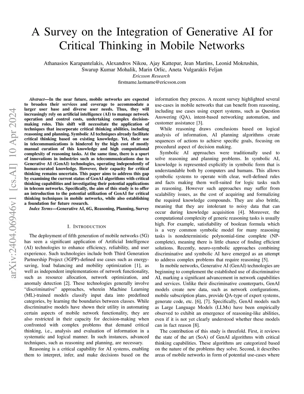 In the near future, mobile networks are expected to broaden their services and coverage to accommodate a larger user base and diverse user needs. Thus, they will increasingly rely on artificial intelligence (AI) to manage network operation and control costs, undertaking complex decision-making roles. This shift will necessitate the application of techniques that incorporate critical thinking abilities, including reasoning and planning. Symbolic AI techniques already facilitate critical thinking based on existing knowledge. Yet, their use in telecommunications is hindered by the high cost of mostly manual curation of this knowledge and high computational complexity of reasoning tasks. At the same time, there is a spurt of innovations in industries such as telecommunications due to Generative AI (GenAI) technologies, operating independently of human-curated knowledge. However, their capacity for critical thinking remains uncertain. This paper aims to address this gap by examining the current status of GenAI algorithms with critical thinking capabilities and investigating their potential applications in telecom networks. Specifically, the aim of this study is to offer an introduction to the potential utilization of GenAI for critical thinking techniques in mobile networks, while also establishing a foundation for future research.