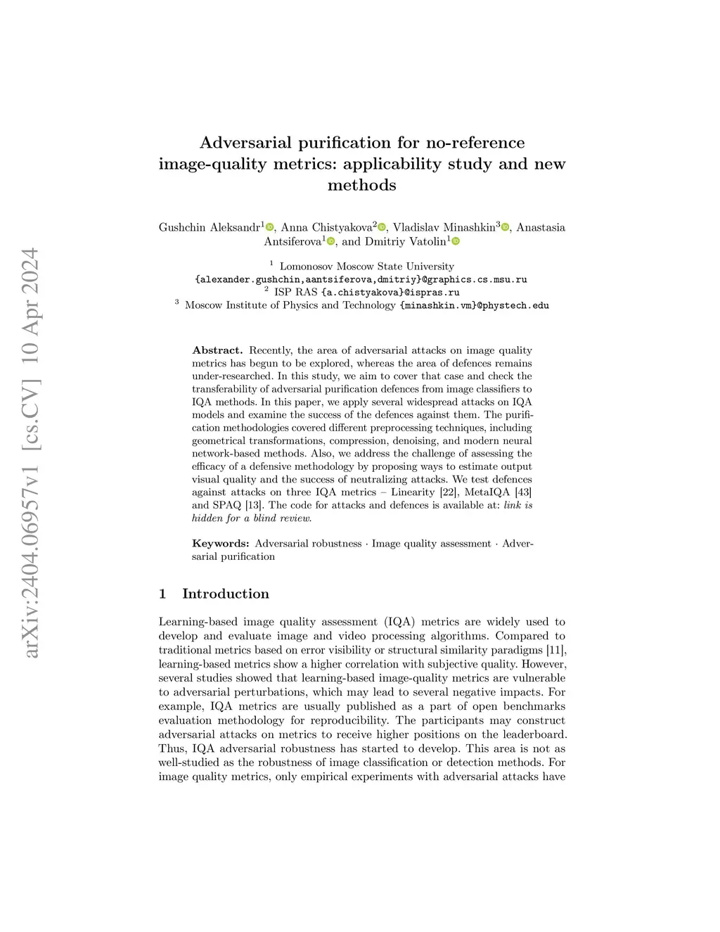 Adversarial purification for no-reference image-quality metrics: