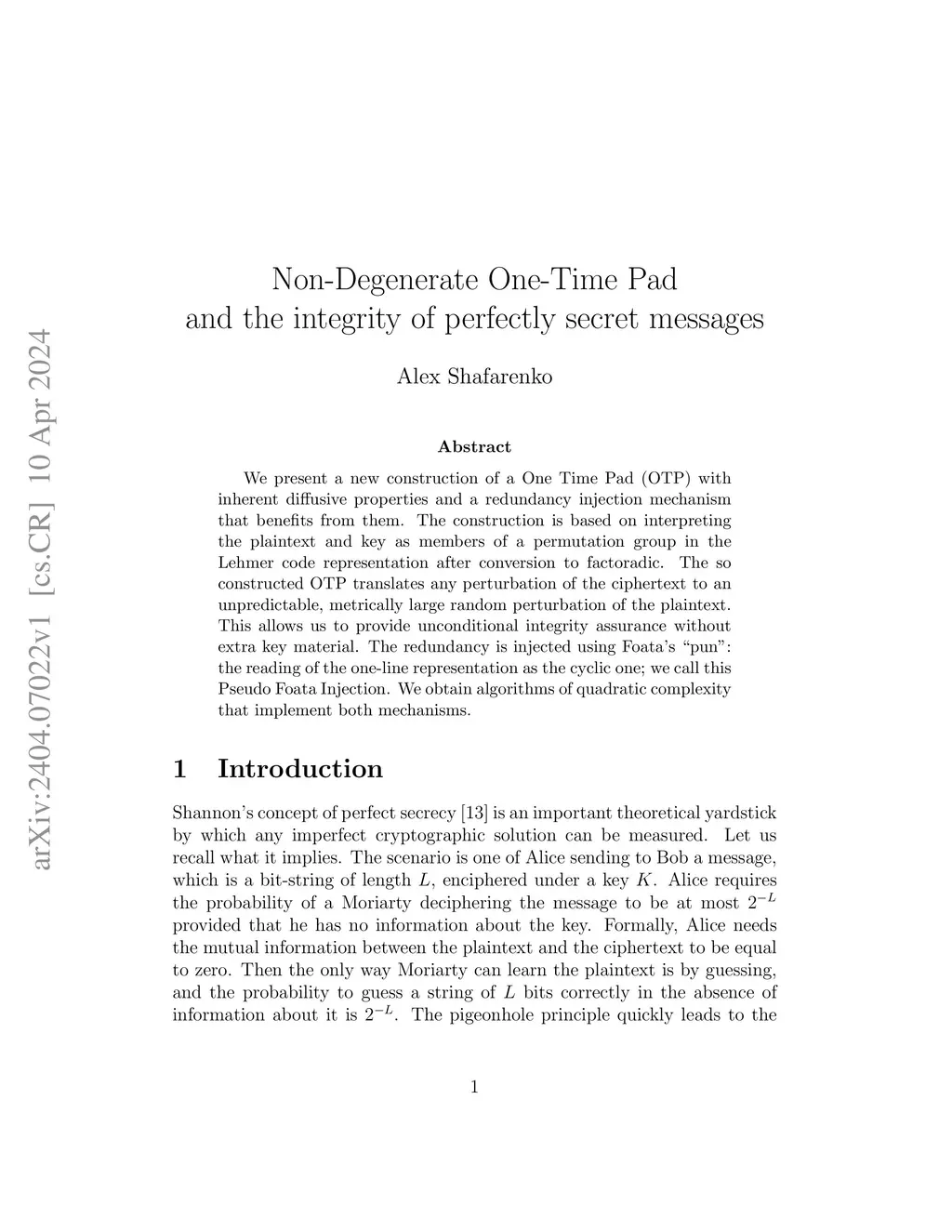 We present a new construction of a One Time Pad (OTP) with inherent diffusive properties and a redundancy injection mechanism that benefits from them. The construction is based on interpreting the plaintext and key as members of a permutation group in the Lehmer code representation after conversion to factoradic. The so constructed OTP translates any perturbation of the ciphertext to an unpredictable, metrically large random perturbation of the plaintext. This allows us to provide unconditional integrity assurance without extra key material. The redundancy is injected using Foata's "pun": the reading of the one-line representation as the cyclic one; we call this Pseudo Foata Injection. We obtain algorithms of quadratic complexity that implement both mechanisms.