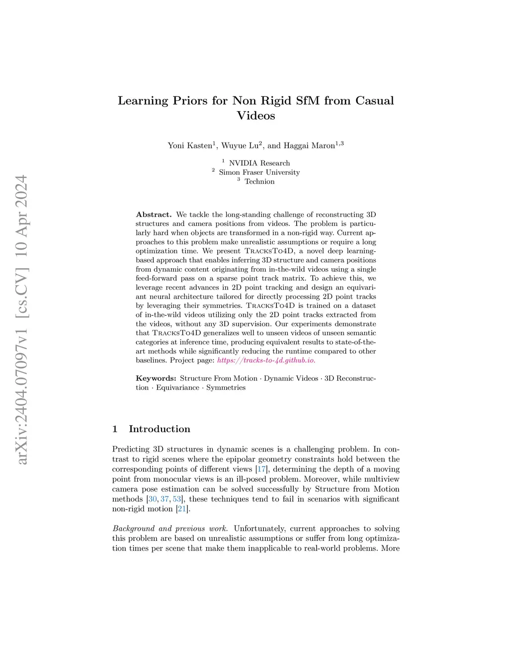 This paper addresses the long-standing challenge of reconstructing 3D structures from videos with dynamic content. Current approaches to this problem were not designed to operate on casual videos recorded by standard cameras or require a long optimization time. Aiming to significantly improve the efficiency of previous approaches, we present TracksTo4D, a learning-based approach that enables inferring 3D structure and camera positions from dynamic content originating from casual videos using a single efficient feed-forward pass. To achieve this, we propose operating directly over 2D point tracks as input and designing an architecture tailored for processing 2D point tracks. Our proposed architecture is designed with two key principles in mind: (1) it takes into account the inherent symmetries present in the input point tracks data, and (2) it assumes that the movement patterns can be effectively represented using a low-rank approximation. TracksTo4D is trained in an unsupervised way on a dataset of casual videos utilizing only the 2D point tracks extracted from the videos, without any 3D supervision. Our experiments show that TracksTo4D can reconstruct a temporal point cloud and camera positions of the underlying video with accuracy comparable to state-of-the-art methods, while drastically reducing runtime by up to 95\%. We further show that TracksTo4D generalizes well to unseen videos of unseen semantic categories at inference time.