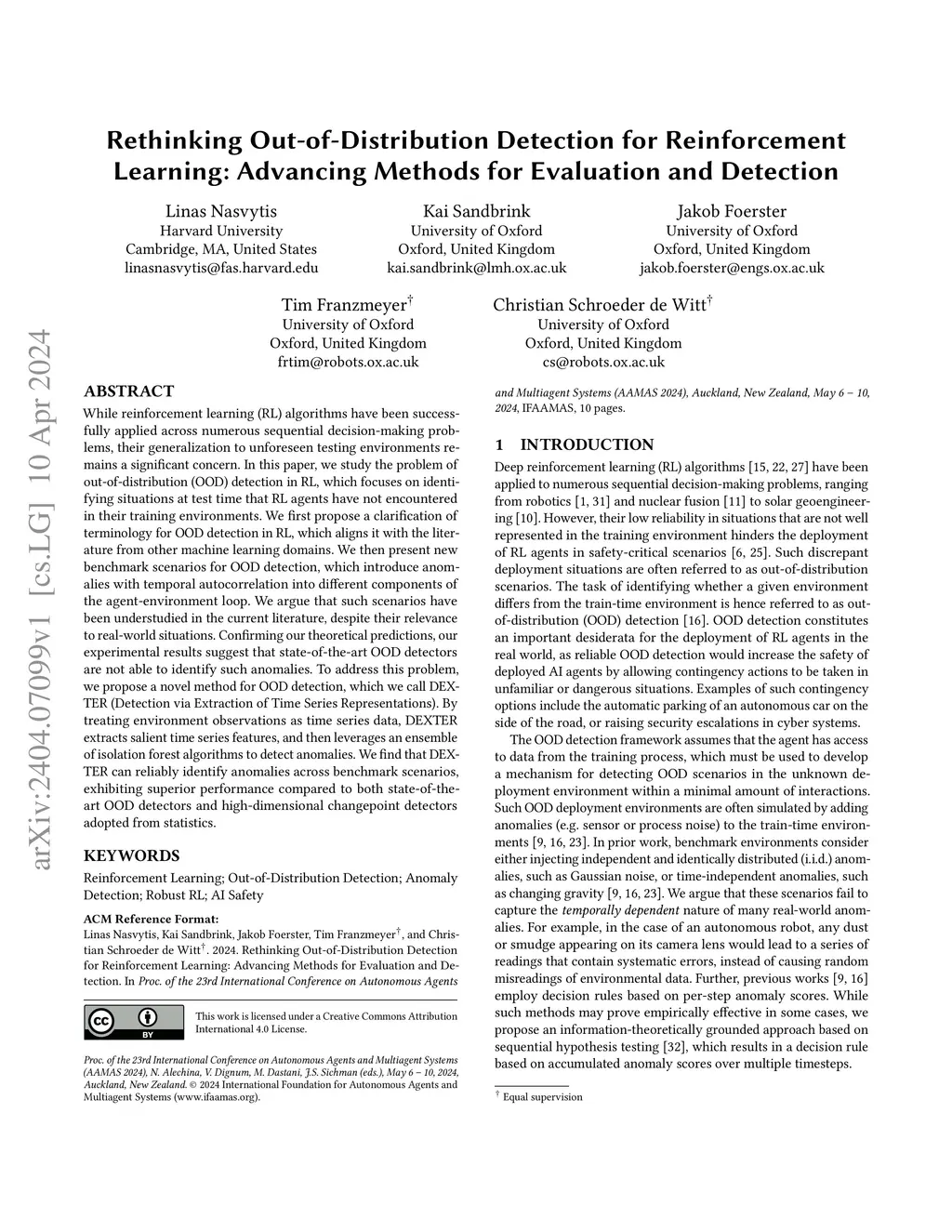 While reinforcement learning (RL) algorithms have been successfully applied across numerous sequential decision-making problems, their generalization to unforeseen testing environments remains a significant concern. In this paper, we study the problem of out-of-distribution (OOD) detection in RL, which focuses on identifying situations at test time that RL agents have not encountered in their training environments. We first propose a clarification of terminology for OOD detection in RL, which aligns it with the literature from other machine learning domains. We then present new benchmark scenarios for OOD detection, which introduce anomalies with temporal autocorrelation into different components of the agent-environment loop. We argue that such scenarios have been understudied in the current literature, despite their relevance to real-world situations. Confirming our theoretical predictions, our experimental results suggest that state-of-the-art OOD detectors are not able to identify such anomalies. To address this problem, we propose a novel method for OOD detection, which we call DEXTER (Detection via Extraction of Time Series Representations). By treating environment observations as time series data, DEXTER extracts salient time series features, and then leverages an ensemble of isolation forest algorithms to detect anomalies. We find that DEXTER can reliably identify anomalies across benchmark scenarios, exhibiting superior performance compared to both state-of-the-art OOD detectors and high-dimensional changepoint detectors adopted from statistics.