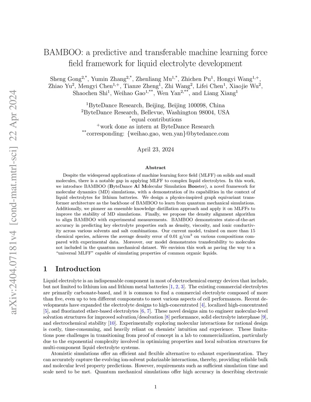 Despite the widespread applications of machine learning force fields (MLFF) in solids and small molecules, there is a notable gap in applying MLFF to simulate liquid electrolyte, a critical component of the current commercial lithium-ion battery. In this work, we introduce BAMBOO (\textbf{B}yteDance \textbf{A}I \textbf{M}olecular Simulation \textbf{Boo}ster), a predictive framework for molecular dynamics (MD) simulations, with a demonstration of its capability in the context of liquid electrolyte for lithium batteries. We design a physics-inspired graph equivariant transformer architecture as the backbone of BAMBOO to learn from quantum mechanical simulations. Additionally, we introduce an ensemble knowledge distillation approach and apply it to MLFFs to reduce the fluctuation of observations from MD simulations. Finally, we propose a density alignment algorithm to align BAMBOO with experimental measurements. BAMBOO demonstrates state-of-the-art accuracy in predicting key electrolyte properties such as density, viscosity, and ionic conductivity across various solvents and salt combinations. The current model, trained on more than 15 chemical species, achieves the average density error of 0.01 g/cm on various compositions compared with experiment.