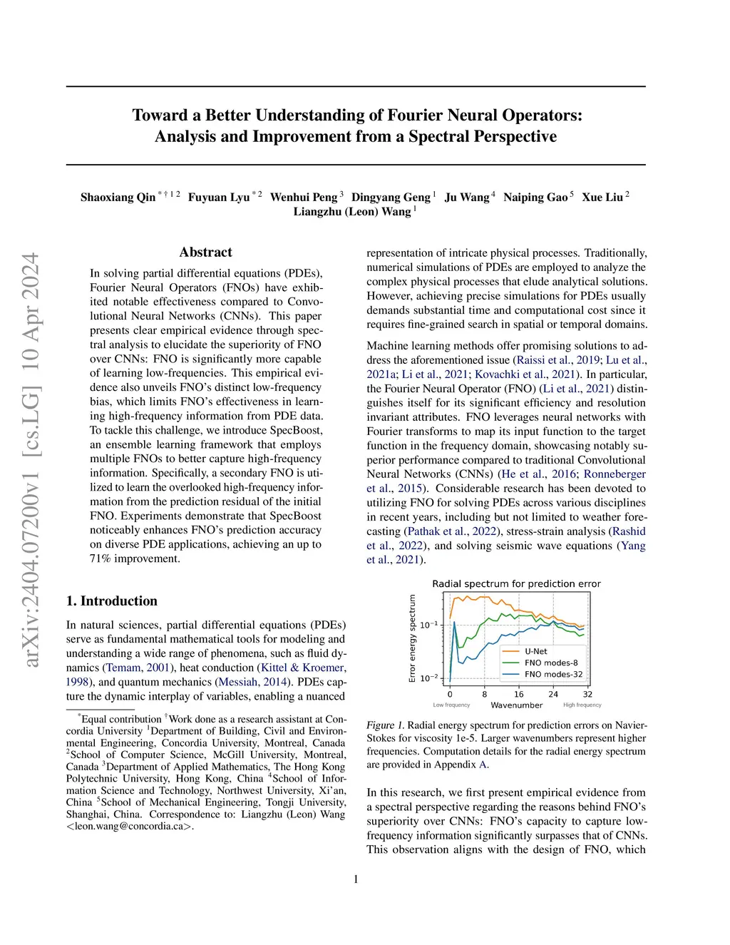 In solving partial differential equations (PDEs), Fourier Neural Operators (FNOs) have exhibited notable effectiveness compared to Convolutional Neural Networks (CNNs). This paper presents clear empirical evidence through spectral analysis to elucidate the superiority of FNO over CNNs: FNO is significantly more capable of learning low-frequencies. This empirical evidence also unveils FNO's distinct low-frequency bias, which limits FNO's effectiveness in learning high-frequency information from PDE data. To tackle this challenge, we introduce SpecBoost, an ensemble learning framework that employs multiple FNOs to better capture high-frequency information. Specifically, a secondary FNO is utilized to learn the overlooked high-frequency information from the prediction residual of the initial FNO. Experiments demonstrate that SpecBoost noticeably enhances FNO's prediction accuracy on diverse PDE applications, achieving an up to 71% improvement.