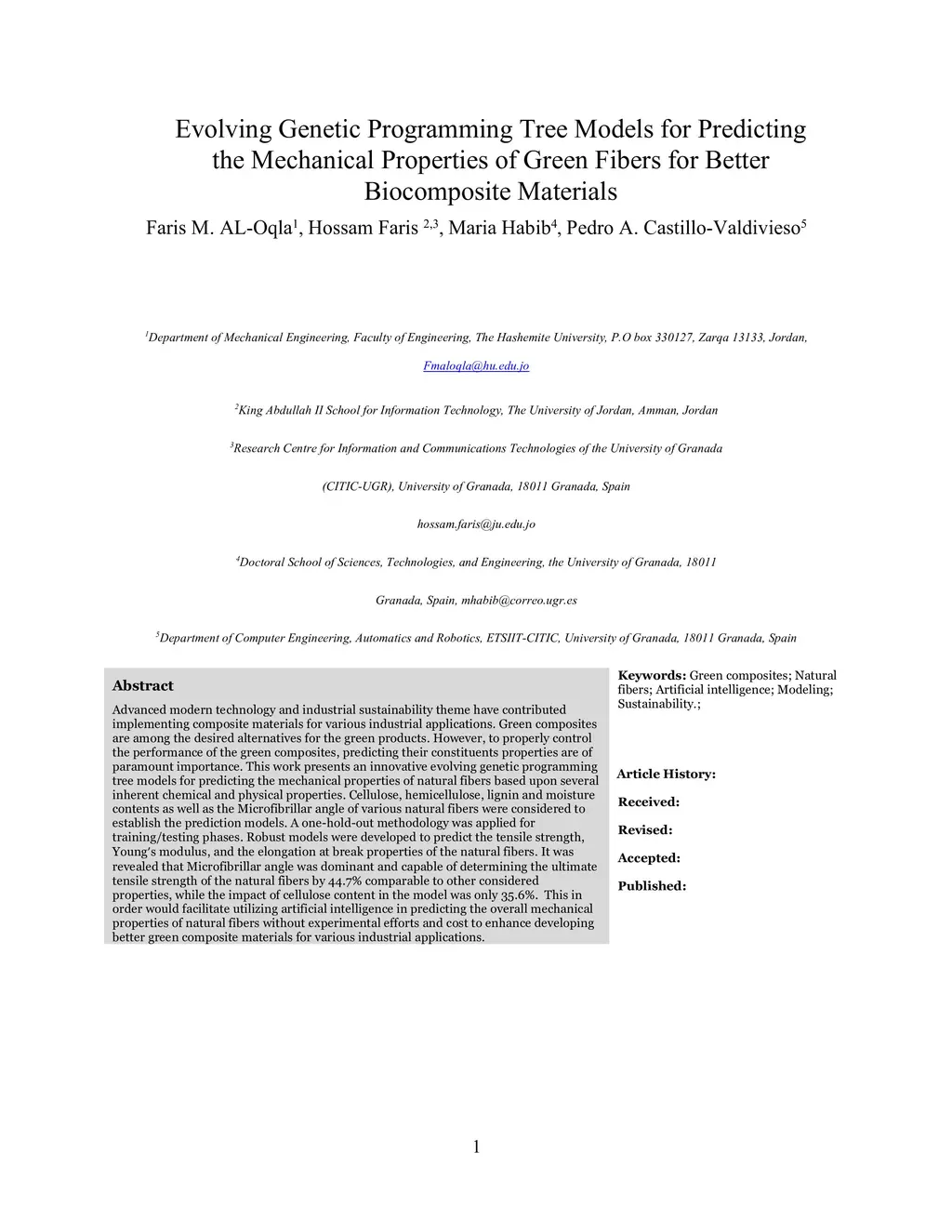 Advanced modern technology and industrial sustainability theme have contributed implementing composite materials for various industrial applications. Green composites are among the desired alternatives for the green products. However, to properly control the performance of the green composites, predicting their constituents properties are of paramount importance. This work presents an innovative evolving genetic programming tree models for predicting the mechanical properties of natural fibers based upon several inherent chemical and physical properties. Cellulose, hemicellulose, lignin and moisture contents as well as the Microfibrillar angle of various natural fibers were considered to establish the prediction models. A one-hold-out methodology was applied for training/testing phases. Robust models were developed to predict the tensile strength, Young's modulus, and the elongation at break properties of the natural fibers. It was revealed that Microfibrillar angle was dominant and capable of determining the ultimate tensile strength of the natural fibers by 44.7% comparable to other considered properties, while the impact of cellulose content in the model was only 35.6%. This in order would facilitate utilizing artificial intelligence in predicting the overall mechanical properties of natural fibers without experimental efforts and cost to enhance developing better green composite materials for various industrial applications.