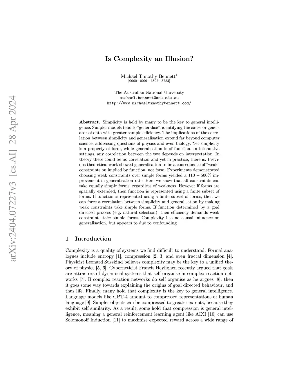 Simplicity is held by many to be the key to general intelligence. Simpler models tend to "generalise", identifying the cause or generator of data with greater sample efficiency. The implications of the correlation between simplicity and generalisation extend far beyond computer science, addressing questions of physics and even biology. Yet simplicity is a property of form, while generalisation is of function. In interactive settings, any correlation between the two depends on interpretation. In theory there could be no correlation and yet in practice, there is. Previous theoretical work showed generalisation to be a consequence of "weak" constraints on implied by function, not form. Experiments demonstrated choosing weak constraints over simple forms yielded a 110-500% improvement in generalisation rate. Here we show that all constraints can take equally simple forms, regardless of weakness. However if forms are spatially extended, then function is represented using a finite subset of forms. If function is represented using a finite subset of forms, then we can force a correlation between simplicity and generalisation by making weak constraints take simple forms. If function determined by a goal directed process (e.g. natural selection), then efficiency demands weak constraints take simple forms. Complexity has no causal influence on generalisation, but appears to due to confounding.