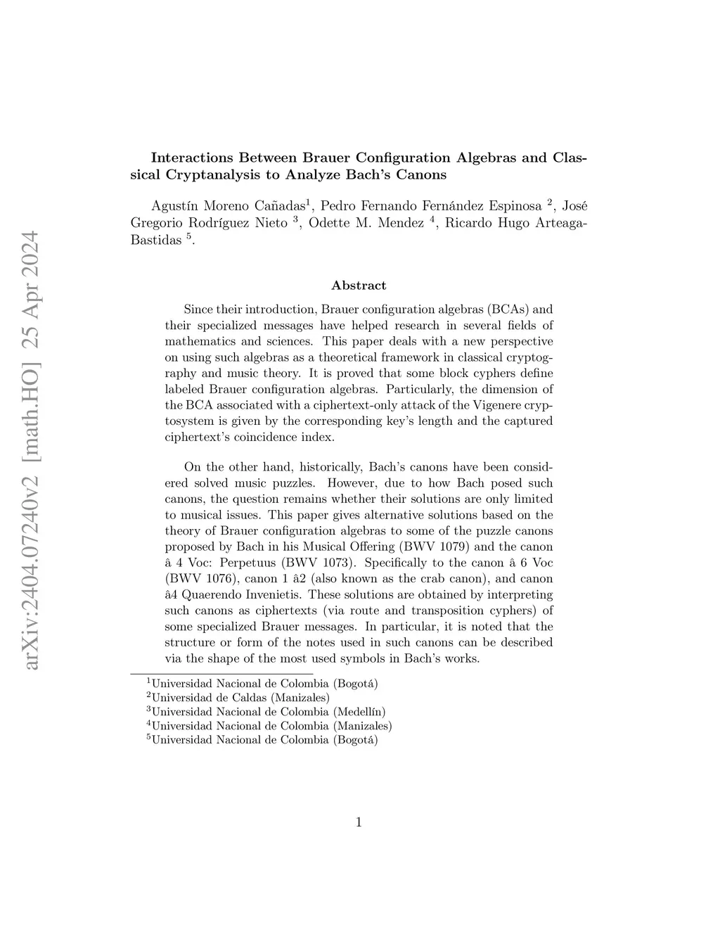 Since their introduction, Brauer configuration algebras (BCAs) and their specialized messages have helped research in several fields of mathematics and sciences. This paper deals with a new perspective on using such algebras as a theoretical framework in classical cryptography and music theory. It is proved that some block cyphers define labeled Brauer configuration algebras. Particularly, the dimension of the BCA associated with a ciphertext-only attack of the Vigenere cryptosystem is given by the corresponding key's length and the captured ciphertext's coincidence index. On the other hand, historically, Bach's canons have been considered solved music puzzles. However, due to how Bach posed such canons, the question remains whether their solutions are only limited to musical issues. This paper gives alternative solutions based on the theory of Brauer configuration algebras to some of the puzzle canons proposed by Bach in his Musical Offering (BWV 1079) and the canon \^a 4 Voc: Perpetuus (BWV 1073). Specifically to the canon \^a 6 Voc (BWV 1076), canon 1 \^a2 (also known as the crab canon), and canon \^a4 Quaerendo Invenietis. These solutions are obtained by interpreting such canons as ciphertexts (via route and transposition cyphers) of some specialized Brauer messages. In particular, it is noted that the structure or form of the notes used in such canons can be described via the shape of the most used symbols in Bach's works.